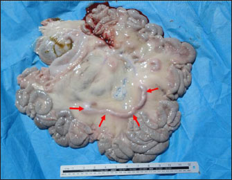 Fig. 5. Postmortem findings in a goat with paratuberculosis. Image shows enlargement of the mesenteric lymph nodes (red arrows). Treatment and controlDepending on the fact that MAP organisms are in vitro resistant to chemotherapeutic agents, therefore, successful response of PTB in sheep and goats has not been documented in diseased animals (Maroudam et al., 2015). The control of PTB in sheep and goats can be easily performed by vaccination that prevents clinical cases and increases productivity. Since bacterial excretion is significantly reduced, vaccination can help mitigate the risk of environmental contamination (Juste and Perez, 2011). Risk factors contributing to the pathogenesis of PTB included animal trading, flock size, and whether other animals such as cattle were reared within the flock (Schrott et al., 2023).