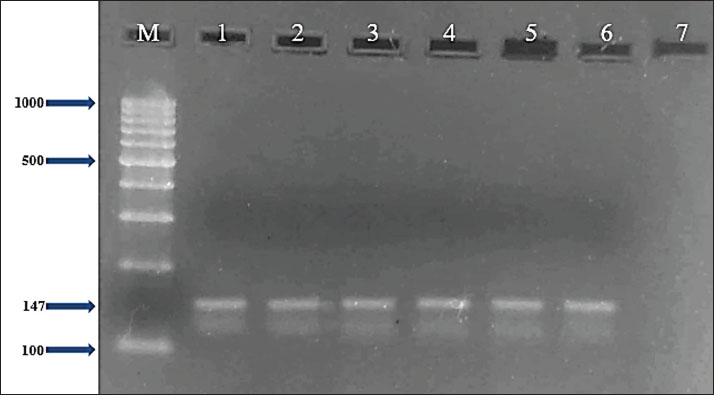 Fig. 2. Two percent agarose gel electrophoresis displaying the amplification of the mecA gene with molecular weight (147 bp) in S. aureus isolates.