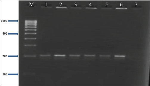 Fig. 4. Two percent agarose gel electrophoresis displaying the amplification of the clfB gene with molecular weight (203 bp) in S. aureus isolates.