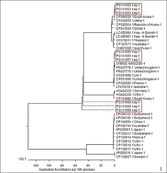 Fig. 6. Clustering analysis of S. aureus isolates’ gene sequences recovered from NCBI. DiscussionThe study intended to reveal the incidence of pathogenic S. aureus in sheep milk of subclinical mastitis-diagnosed cases in Nineveh Governorate, to identify the methicillin-resistant strain of Staphylococcus aureus and recognize the genes encoded virulence factors of S. aureus. Similar findings have been reported in Iraq, where S. aureus was isolated from subclinical mastitis in camels (Sheet, 2022), cattle (Sheet et al., 2021). In addition, this study found that the prevalence of S. aureus isolates from subclinical mastitis was 23.3% (14/60), with differences in prevalence ratios across different districts in Nineveh governorate. Globally, the prevalence of S. aureus in sheep and small ruminants is higher, ranging from 50% to 75% in other countries such as the USA, China, Slovakia, and Italy (De Centorbi et al.,1992; Moroni et al., 2005, Kotzamanidis et al., 2021; Király et al., 2024). The percentage in the examined sample from sheep milk with subclinical mastitis was 20% in Greece through the milking period (Vasileiou et al., 2019) and 27.38% in Algeria (Azzi et al., 2020), which is close to the ratio observed in our study. The variations in S. aureus prevalence rates come from the geographic distributions, hygienic practices in milk production facilities in farms, and the type of technique, which used for detecting the S. aureus in the samples. Recent investigations revealed that S. aureus was found in udder skin, workers’ hands, bedding, insects, and dust, significantly facilitating the transition of S. aureus among animals and their milk (Piccinini et al., 2012). Moreover, the detection of S. aureus in different cow body parts such as the vagina, muzzle, and skin injuries leads to the transmission of S. aureus to the surrounding environments, as well as from dairy herds to their offspring, either through ventilation or by feeding (Mørk et al., 2012). Insufficient cleanliness of milking tools, inadequate udder preparation, unhygienic farm conditions, and improper milk transportation without adhering to cold chain requirements are important factors in the distribution of S. aureus bacterium (Regasa et al., 2019; Altaey, 2025). In addition, the current study appeared that S. aureus isolated from sheep milk samples had the virulence genes (nuc, mecA, clfA, and coa) with a percentage of 100% (14/14) and clfB in 92.9% (13/14), the scientific literature correlated the presence of these genes with animal and human health concerns. Xing et al. (2016) mentioned that nuc gene was commonly present in the isolates of coagulase-positive S. aureus; other studies focus on mecA gene, the responsible for methicillin-resistant properties. The earlier studies showed that the percentage ratio of S. aureus isolates possess the mecA gene was 41.37% (24/58) in sheep milk flocks at some farms in Iran (Rahbarnia et al., 2023). Akgul et al. (2021) declared that the lower ratio of the mecA gene found in the S. aureus isolates in a group of sheep farms in Turkey was 17.2%; in addition, they found the percentage ratio of S. aureus isolated from cheese possessed the mecA gene was 46.7%. Furthermore, the percentage ratio of S. aureus isolated from sheep mastitis milk was 47.5%, and the ratio of the mecA gene detected in S. aureus isolates was 41.4 (Akgul et al., 2021). Moreover, a study in Spain showed that 99.5% of S. aureus isolated from 36 sheep farms were resistant to methicillin, and they possessed the mecA gene (Barrero-Domínguez et al., 2019).