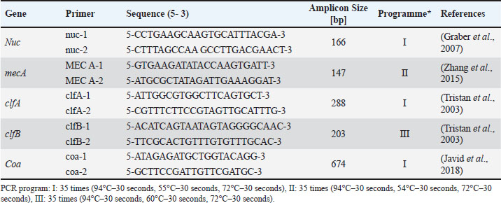 AbstractBackground: Staphylococcus aureus describes the greatest common cause of mastitis in sheep; however, little information was available concerning methicillin-resistant S. aureus (MRSA) in the milk of mastitis sheep. Aim: The current study aimed to find exactly the incidence of S. aureus and MRSA in milk samples from sheep farmhouses in Mosul city, in addition to discovering specific genes that encode virulence factors. Methods: Samples of 60 sheep’s subclinical milk were gathered between October 2023 and February 2024 from various places around the Nineveh governorate. Standard methods that include selective media and biochemical testing were utilized in the current study. Furthermore, the nuc, mecA, clfA, clfB, and coa genes in S. aureus were determined utilizing a polymerase chain reaction technique. Results: According to our findings, S. aureus was found in sheep subclinical mastitis at a rate of 23.3% (14/60) in sheep milk. Furthermore, all S. aureus isolates 100% appeared to carrying of the nuc, mecA, clfA, and coa genes, while 92.9% of isolates were positive for the clfB gene. The gene profiles of S. aureus isolates were divided into two primary categories. Based on the clfA, clfB, and coa genes, nine unique strains of S. aureus sequences were submitted to the NCBI GenBank. The phylogenetic tree analysis of all study isolates demonstrated its identity to various strains in the NCBI-BLAST. Conclusion: The incidence of S. aureus infections emphasized the presence of an issue in husbandry practices, insufficient adherence to basic hygiene protocols, and the random use of antibiotics. Keywords: Phylogenetic analysis tree, S. aureus, Sheep milk, Virulence factors. IntroductionDairy ruminants are frequently infected with intra-mammary infections (IMI), which represent a widespread disease that leads to significant financial losses (Kossaibati and Esslemont, 1997). The expenses associated with mastitis directly relate to veterinarian services and raise labor needs (Lescourret and Coulon, 1994). Poor milk quality and yield as a consequence of mastitis is the primary economic loss linked to all forms of mastitis (Seegers et al., 2003). In herds of sheep, the yearly prevalence of the clinical IMI was typically less of 5%. However, in a limited number of large groups of sheep, the frequency of a disease may surpass 30%–50% of the ruminant, resulting in a death rate (gangrenous mastitis) or killing the infected animals up to 70% of the herd (Bergonier et al., 2003). Furthermore, subclinical or clinical Staphylococcus aureus IMI cases have an effect on 3%–37% of groups of sheep and are significant of the legal, sanitary, and financial reasons. These situations additionally affect consumers of dairy products (Bergonier et al., 2003). Although over 100 distinct kinds of microorganisms are identified in the udder of ruminants, just a small percentage of these microbes can lead to mastitis (Owens and Watts, 1988). The microorganisms causing inflammation of mammary glands can be classified into two groups based on their reservoir, source, and route of transmission: contagious bacteria and environmental bacteria (Ruegg, 2012). Staphylococcus aureus is regarded as a major pathogen found in sheep, causing both preclinical and symptomatic intra-mammary infections; some of these isolates may have a broad geographical distribution (Smith et al., 2005). According to a number of previous studies, S. aureus isolated from cows’ mastitis (Sheet, 2022) and camel milk (Sheet et al., 2021). Many researchers showed that S. aureus is found in various types of food such as milk and its products (Vyletělová et al., 2011), meat (Sheet et al., 2023), and fish (Taha et al., 2024). Numerous virulence factors are found in S. aureus, and the various combinations of these factors, along with the infection place and the host immune response’s heterogeneity, result in the vast range of outcomes linked to these infections (Lowy, 1998). The degree and indicators of S. aureus infections correspond with virulence factors (Xing et al., 2014). Among them, foodborne poisoning is typically caused by staphylococcal enterotoxins (SEs). Food poisoning resulting from S. aureus harboring SEs may occur quickly, progress swiftly, and present a serious risk to human health (Basanisi et al., 2017). Furthermore, some S. aureus strains produce a variety of toxins, including exfoliative toxins A and B, toxic shock syndrome toxin-1 (tsst), SEs, and toxic shock syndrome toxin-like (SEls). It is widely recognized that food-related illnesses are mainly caused by SEs or SEls (Argudín et al., 2010). According to reports, these five classic enterotoxins account for 95% of staphylococcal food poisoning cases, with recently identified SEs responsible for the other 5% of infections (Papadopoulos et al., 2019). Staphylococcus aureus isolates can be detected using a variety of techniques. The conventional techniques depend on conventional biochemical testing and the structural characteristics of S. aureus colonies. Molecular techniques are more precise and quicker, yielding findings in 3–5 hours for the recognition of S. aureus (Ahmed et al., 2020). There are various molecular recognition techniques, such as loop-mediated isothermal amplification, real-time polymerase chain reaction, and polymerase chain reaction (PCR). Moreover, all genes encoding virulence factors have been identified by molecular techniques. Due to the significance of pathogenic S. aureus in subclinical mastitis in sheep, the objective of our study is to recognize the pathogen S. aureus in the milk of sheep infected via subclinical mastitis in the governorate of Nineveh, to determine which S. aureus strain is resistant to methicillin and which genes in S. aureus isolates encode virulence factors. Materials and MethodsSamples collectionBased on the California mastitis test, 60 sheep subclinical milk samples were obtained from different locations across the governorat