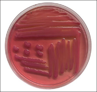 Fig. 1. Presumptive K. pneumoniae colonies on Mac Conkey Agar media are mucoid and pale pink in color.