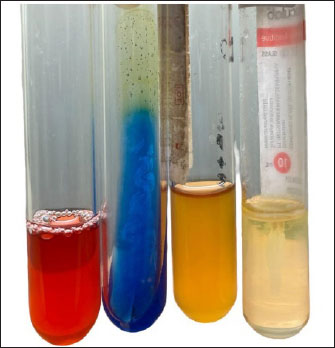 Fig. 2. Positive result of K. pneumonia in IMViC test. From left to right: voges Proskauer media; Simmon Citrate Agar Media, Methyl Red Media, Sulfide indole motility media. DiscussionThe existence of a bacterial growth inhibition zone surrounding the antibiotic disk characterizes the outcomes of tests for antibiotic resistance conducted using the Kirby Bauer method. This study showed that 76.2% (16/21) samples were MDR to chepalozin (KZ), trimethoprim (W), levoxacin (LEV), streptomycin (S), penicillin (P), and erythromycin (E). Duck farming is an important initial stage in the duck meat supply chain and the use of antibiotics are used to control pathogens in livestock. Excessive use of antibiotics can facilitate the evolution of multidrug-resistance strains (Khairullah et al., 2019). Duck droppings are also a potential reservoir for antibiotic resistance genes. Therefore, duck farming can play an important role in the production and spread of MDR strains (Prayudi et al., 2023). Longer treatment times and more challenging cures are caused by numerous reports of rising K. pneumoniae multidrug resistance, which includes resistance to carbapenems, ESBL, and fluoroquinolones (Li et al., 2023). Humans and livestock-derived Enterobactericeae may serve as a reservoir for the propagation of antibiotic resistance. A study conducted by Xu et al. (2024) stated that 186 out of 215 (86.51) Enterobactericeae strains isolated from duck farms in Zhejiang were multidrug resistant. The bacteria showed resistance to tetracycline, oxacycline, amoxicillin, trimethoprim, and chloramphenicol. Most of these six antibiotics are categorized as “critically important antimicrobials” for humans (Scott et al., 2019). Klebsiella pneumoniae has a high level of resistance to cefazolin, amoxicillin-clavulanic acid, cefuroxime, and cefepime. Resistance to these antibiotics comes from water which is a shared resource between wild animals, pets, livestock, and humans. Additional research has also shown that common areas like soil and water are crucial for the spread of antibiotic resistance (Iramiot et al., 2020). Klebsiella pneumoniae isolates in this study were resistant to the antibiotics cephalozin, trimethoprim, Levoxacin, Strepromycin, Penicillin, and Erythomycin. Permatasari et al. (2020) reported that K. pneumoniae isolated from chicken farms in Blitas district showed multidrug resistance to ampicillin 75%, erythromycin 42.86%, Erythromycin 42.86%, Tetracycline 35.72%, Sulfamethoxazole 32.14%, and Streptomycin 21.4%. Klebsiella spp. are naturally sensitive or moderate to penicillin, all aminoglycosides, cotrimoxazole, tetracyclines, quinolones, chloramphenicol, trimethoprim, and nitrofurantoin tested (Patilaya et al., 2019). Table 1. Percentage of K. pneumoniae antibiotic sensitivity test results.