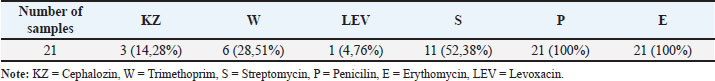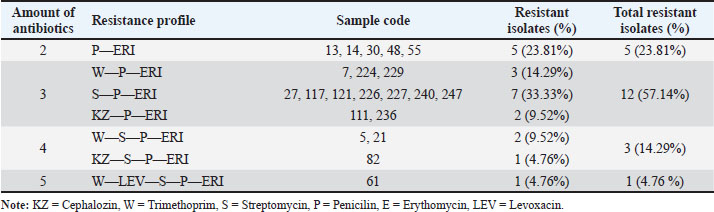 Fig. 4. Diagram of K. pneumoniae resistance profile. ConclusionKlebsiella pneumoniae was found in duck cloacal swabs taken from duck farms in three different sub-districts, namely Paras sub-district, Karang Turi sub-district, and Tembelang sub-district, Jombang district, as many as 100% (21/21) samples (100%) isolates were resistant to antibiotics and 76.19% (16/21) isolates were multidrug resistant. This study showed that 76.2% (16/21) samples were MDR to chepalozin, trimethoprim, levoxacin, streptomycin, penicillin, and erythomycin. The presence of bacteria that are resistant to many types of antibiotics is a threat to public and animal health. Veterinary policies and supervision are important to implement in the treatment of diseases and livestock in Indonesia. AcknowledgmentsThis study was done to fulfill the requirements for Degree in Master of Science in Veterinary Disease and Veterinary Public Health, Faculty of Veterinary Medicine, Universitas Airlangga. Conflict of interestThe authors declare that there is no conflict of interest. FundingThis study was partly supported by The International Research Consortium, Lembaga Penelitian dan Pengabdian Masyarakat, Universitas Airlangga, Surabaya, Indonesia in the year 2024 with grant number: 171/UN3.LPPM/PT.01.03/2024. Author’s contributionsNLNT and WT: Conceptualization and design. WW, SNA, and ZAB: Acquisition of data. MHE and IBM: Formal analysis and interpretation of data. ARK and YP: Writing-original draft preparation. SMY, RZA, and KHPR: Writing-review and editing. All authors have read and agreed to the published version of the manuscript. Data availabilityAll data are available in the manuscript. ReferencesAkpaka, P.E., Vaillant, A., Wilson, C. and Jayaratne, P. 2021. Extended spectrum beta-lactamase (ESBL) produced by gram-negative bacteria in Trinidad and Tobago. Int. J. Microbiol. 2021(1), 5582755. Alders, R.G., Dumas, S.E., Rukambile, E., Magoke, G., Maulaga, W., Jong, J. and Costa, R. 2018. Family poultry: multiple roles, systems, challenges, and options for sustainable contributions to household nutrition security through a planetary health lens. Matern. Child Nutr. 14(Suppl 3), e12668. CDC. 2019. Antibiotic resistance threats in the United States. Atlanta, Georgia, United States. Centers for Disease Control and Prevention. Available at: https://www.cdc.gov/drugresistance/pdf/threatsreport/2019-ar-threats-report-508.pdf. Accessed on August 15, 2024. Comerford, K.B., Miller, G.D., Kapsak, W.R. and Brown, K.A. 2021. The complementary roles for plant-source and animal-source foods in sustainable healthy diets. Nutrients 13(10), 3469. Effendi, M.H., Bintari, I.G., Aksoro, E.B. and Hermawan. I.P. 2018. Detection of blaTEM Gene of Klebsiella pneumoniae Isolated from swab of food- producing animals in East Java. Trop. Anim. Sci. J. 41(3), 174–178. Fanissa, F., Effendi, M.H., Tyasningsih, W. and Ugbo, E.N. 2022. Multidrug-resistant Salmonella species from chicken meat sold at Surabaya Traditional Markets, Indonesia. Biodiversitas 23(6), 2823–2829. Franklin-Alming, F.V., Kaspersen, H., Hetland, M.A.K., Bakksjø, R.J., Nesse, L.L., Leangapichart, T., Löhr, I.H., Telke, A.A. and Sunde, M. 2021. Exploring Klebsiella pneumoniae in healthy poultry reveals high genetic diversity, good biofilm-forming abilities and higher prevalence in Turkeys than broilers. Front. Microbiol. 12(1), 725414. Henchion, M., Moloney, A.P., Hyland, J., Zimmermann, J. and McCarthy, S. 2021. Review: trends for meat, milk and egg consumption for the next decades and the role played by livestock systems in the global production of proteins. Animal 15(Suppl 1), 100287. Iramiot, J.S., Kajumbula, H., Bazira, J., Kansiime, C. and Asiimwe, B.B. 2020. Antimicrobial resistance at the human-animal interface in the Pastoralist Communities of Kasese District, South Western Uganda. Sci. Rep. 10(1), 14737. Khairullah, A.R., Rahardjo, D., Rahmahani, J., Tyasningsih, W. and Harijani, N. 2019. Antibiotics resistant at Staphylococcus aureus and Streptococcus sp isolated from bovine mastitis in Karangploso, East Java, Indonesia. Indian J. Forensic Med. Toxicol. 13(4), 439–444. Lee, D., Oh, J.Y., Sum, S. and Park, H.M. 2021. Prevalence and antimicrobial resistance of Klebsiella species isolated from clinically ill companion animals. J. Vet. Sci. 22(2), e17. Li, Y., Kumar, S., Zhang, L., Wu, H. and Wu, H. 2023. Characteristics of antibiotic resistance mechanisms and genes of Klebsiella pneumoniae. Open Med. (Wars). 18(1), 20230707. Patilaya, P., Husori, D.I. and Marhafanny, L. 2019. Susceptibility of Klebsiella Pneumoniae isolated from Pus specimens of post-surgery patients in Medan, Indonesia to selected antibiotics. Open Access Maced. J. Med. Sci. 7(22), 3861–3864. Permatasari, D.A., Witaningrum, A.M., Wibisono, F.J. and Effendi, M.H. 2020. Detection and prevalence of multidrug-resistant Klebsiella pneumoniae strain isolated from poultry farms in Blitar, Indonesia. Biodiversitas 21(10), 4642–4647. Prayudi, S.K.A., Effendi, M.H., Lukiswanto, B.S., Az Zah-Ra, R.L., Benjamin, M.I., Kurniawan, S.C., Khairullah, A.R., Silaen, O.S.M., Lisnanti, E.F., Baihaqi, Z.A., Widodo, A. and Riwu, K.H.P. (2023). Detection of Genes on Escherichia coli producing extended spectrum β-lactamase isolated from the small intestine of ducks in traditional markets Surabaya City, Indonesia. J. Adv. Vet. Res. 13(8), 1600–1608. Rahman, M.T., Sobur, M.A., Islam, M.S., Ievy, S., Hossain, M.J., El Zowalaty, M.E., Rahman, A.T. and Ashour, H.M. 2020. Zoonotic diseases: etiology, impact, and control. Microorganisms 8(9), 1405. Riwu, K.H.P., Effendi, M.H., Rantam, F.A., Khairullah, A.R. and Widodo, A. 2022a. A review: virulence factors of Klebsiella pneumonia as emerging infection on the food chain, Vet. World 15(9), 2172–2179. Riwu, K.H.P., Rantam, F.A., Effendi, M.H., Khairullah, A.R., Widodo, A., Kurniawan, S.C. and Ugbo, E.N. 2022b. Molecular detection of extended spectrum β-lactamase producing K