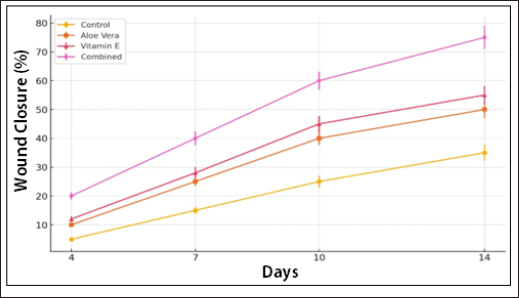 Fig. 1. The graph illustrates the wound closure rate (%) over time (days) for four different treatment groups: control, A. vera, vitamin E, and combined treatment (A. vera + vitamin E). Measurements were taken at four key time points: Days 4, 7, 10, and 14 for Control Group Aloe vera Group; Vitamin E Group and Combined Treatment Group. Histopathological findingsHistopathological analysis was conducted on day 14 to evaluate the quality of wound healing at the microscopic level. Key parameters assessed included re-epithelialization, granulation tissue formation, collagen deposition, and inflammatory cell infiltration. Control group The control group exhibited incomplete re- epithelialization, moderate granulation tissue formation, and sparse collagen deposition. A significant number of inflammatory cells were present, indicating ongoing inflammation and delayed wound healing. Aloe vera groupThe A. vera group showed improved reepithelialization and more organized granulation tissue compared with the control group. Collagen fibers were moderately organized, and inflammatory cell infiltration was reduced, indicating better healing. Vitamin E group The vitamin E group exhibited similar improvements as the A. vera group, with enhanced collagen deposition and better-organized granulation tissue. Inflammatory cell infiltration was lower than that of the control, reflecting more advanced healing. Combined group The combined group had the most advanced wound healing. Nearly complete re-epithelialization, dense granulation tissue formation, and high collagen deposition were observed. The inflammatory cell infiltration was minimal, indicating that the healing was well-resolved. The histopathological features of wound tissues, including re-epithelialization, granulation tissue formation, collagen deposition, and inflammatory cell infiltration, observed in the Control, A. Vera, vitamin E, and Combined treatment groups. Histopathological scores for re-epithelialization, granulation tissue formation, collagen deposition, and inflammatory cell infiltration on day 14 in the different treatment groups. The combined treatment group exhibited the most advanced healing Figure 2.