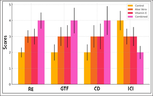 Fig. 2. Mean (±SD) histopathological scores for key wound healing parameters, including Re- Epithelialization (RE), Granulation Tissue Formation (GTF), Collagen Deposition (CD), and Inflammatory Cell Infiltration (ICI), in rabbit wounds treated with A. vera, vitamin E, their combination, and control. Each color represents a different treatment group: Control (yellow), A. Vera (orange), vitamin E (red), and Combined (magenta). The heightened scores in the A. vera, vitamin E, and combined groups compared with the control group suggest enhanced wound repair and tissue regeneration. Biochemical analysisBiochemical markers of wound healing were measured, including hydroxyproline levels (indicative of collagen content), SOD activity, and CAT activity. These markers provided insight into the antioxidant capacity and tissue regeneration of the groups. Hydroxyproline levels The hydroxyproline content was highest in the combined treatment group (6.0 mg/g tissue), indicating enhanced collagen synthesis. The A. vera and vitamin E groups showed moderate increases in hydroxyproline content compared with the control group Figure 3.