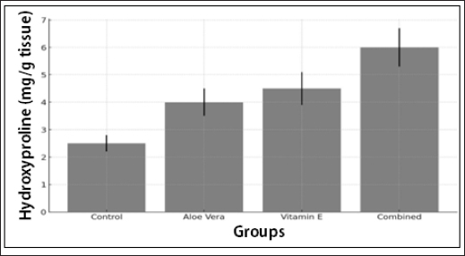 Fig. 3. The figure depicts hydroxyproline levels (µg/mg of tissue) across the four treatment groups—Control, A. Vera, vitamin E, and Combined (A. Vera + vitamin E)—measured at the endpoint of the study to evaluate collagen content and wound healing efficacy. SOD activity The combined treatment group exhibited the highest SOD activity (35 U/mg protein), indicating better antioxidant protection. The A. vera and vitamin E groups also had elevated SOD levels compared with the control group. CAT activity Similar to that of SOD, CAT activity was highest in the combined group (22 U/mg protein). The A. Vera and vitamin E groups exhibited moderate increases in CAT activity, whereas the control group had the lowest levels. The levels of hydroxyproline, SOD, and CAT activity in the wound tissues of the control, A. Vera, vitamin E, and Combined treatment groups. The combined application of A. Vera and vitamin E significantly outperformed individual treatments and the control group in all aspects of wound healing. This group had the fastest wound closure, the most advanced histological features, and the highest biochemical marker levels Figure 6. The A. Vera and vitamin E groups individually also showed improved healing compared with the control group, but the combined treatment exhibited a synergistic effect, resulting in enhanced tissue repair, higher collagen synthesis, and better antioxidant defense. SOD activity levels in wound tissues from each treatment group, with the combined treatment showing the highest antioxidant enzyme activity Figure 4.
