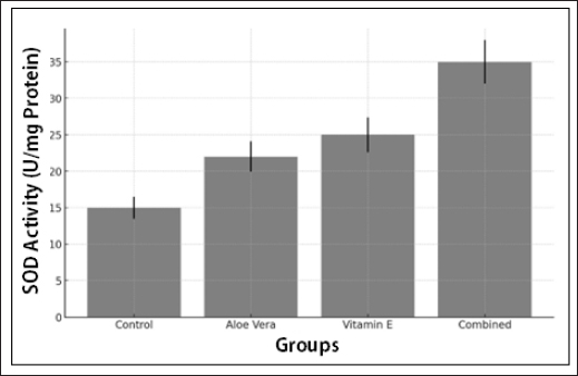 Fig. 4. The figure illustrates SOD activity (units/mg of protein) in the four treatment groups— Control, A. Vera, vitamin E, and Combined (A. Vera + vitamin E). SOD activity serves as a critical marker of the antioxidant defense mechanism during wound healing, indicating its ability to neutralize superoxide radicals and reduce oxidative stress. CAT activity levels in wound tissues from the treatment groups demonstrate the enhanced antioxidant protection provided by the combined treatment Figure 5.