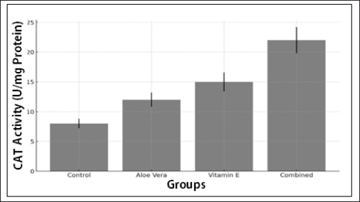 Fig. 5. The figure illustrates CAT activity (units/mg of protein) across the four treatment groups—Control, A. Vera, vitamin E, and Combined (A. Vera + vitamin E). CAT activity reflects the enzymatic antioxidant defense system’s ability to decompose hydrogen peroxide (H2O2) into water and oxygen, thereby reducing oxidative stress and preventing cellular damage during wound healing. DiscussionThe results of this study provide compelling evidence for the enhanced wound-healing effects of the combined application of A. vera leaf extract and vitamin E compared with their individual use and a saline-treated control. This discussion will elaborate on the underlying mechanisms and implications of these findings across various parameters: wound closure rate, histopathological features, and biochemical markers. The wound closure rate is a key indicator of the effectiveness of any wound treatment. In this study, the combined A. Vera + vitamin E treatment group exhibited the fastest and most substantial wound closure, with a 75% reduction in the wound area by day 14, compared with 50% and 55% reductions in the . Vera and vitamin E groups, respectively. The control group, which was treated with saline, showed only a 35% reduction, reflecting the natural but slow progression of untreated wound healing. The superior performance of the combined treatment can be attributed to the complementary mechanisms of A. Vera and vitamin East A. Vera has well-documented anti-inflammatory properties, promoting faster wound contraction by reducing inflammation and stimulating fibroblast activity. Vitamin E, on the other hand, is a potent antioxidant that mitigates oxidative stress, which can otherwise delay wound healing by damaging cellular components such as lipids, proteins, and DNA (Liu et al., 2021). Aloe vera reduces inflammation and creates an optimal environment for repair, whereas vitamin E protects the wound from oxidative damage, allowing for more rapid and efficient tissue regeneration. Additionally, collagen synthesis—a crucial component of wound healing—was enhanced in the combined group. Both A. Vera and vitamin E stimulate collagen production, but when used together, they likely act synergistically to increase the deposition and organization of collagen fibers, promoting faster and more robust tissue repair (Liang et al., 2021; Altay et al., 2023).