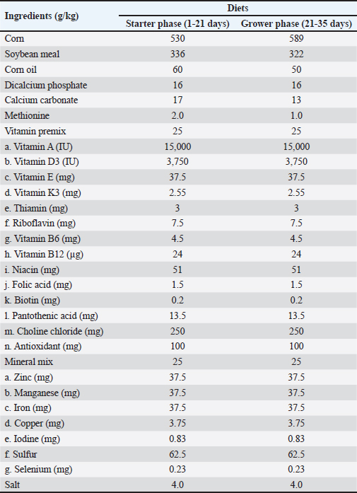 | Pubmed Style Agustono B, Yunita MN, Lokapirnasari WP, Warsito SH, Marbun TD, Windria S. Dietary supplementation of microbiota inoculum and single clove garlic extract on growth performance, egg quality, reproductive organ, and hematological trait in laying quail. Open Vet. J.. 2025; 15(2): 690-699. doi:10.5455/OVJ.2025.v15.i2.17 Web Style Agustono B, Yunita MN, Lokapirnasari WP, Warsito SH, Marbun TD, Windria S. Dietary supplementation of microbiota inoculum and single clove garlic extract on growth performance, egg quality, reproductive organ, and hematological trait in laying quail. https://www.openveterinaryjournal.com/?mno=225079 [Access: January 25, 2026]. doi:10.5455/OVJ.2025.v15.i2.17 AMA (American Medical Association) Style Agustono B, Yunita MN, Lokapirnasari WP, Warsito SH, Marbun TD, Windria S. Dietary supplementation of microbiota inoculum and single clove garlic extract on growth performance, egg quality, reproductive organ, and hematological trait in laying quail. Open Vet. J.. 2025; 15(2): 690-699. doi:10.5455/OVJ.2025.v15.i2.17 Vancouver/ICMJE Style Agustono B, Yunita MN, Lokapirnasari WP, Warsito SH, Marbun TD, Windria S. Dietary supplementation of microbiota inoculum and single clove garlic extract on growth performance, egg quality, reproductive organ, and hematological trait in laying quail. Open Vet. J.. (2025), [cited January 25, 2026]; 15(2): 690-699. doi:10.5455/OVJ.2025.v15.i2.17 Harvard Style Agustono, B., Yunita, . M. N., Lokapirnasari, . W. P., Warsito, . S. H., Marbun, . T. D. & Windria, . S. (2025) Dietary supplementation of microbiota inoculum and single clove garlic extract on growth performance, egg quality, reproductive organ, and hematological trait in laying quail. Open Vet. J., 15 (2), 690-699. doi:10.5455/OVJ.2025.v15.i2.17 Turabian Style Agustono, Bodhi, Maya Nurwartanti Yunita, Widya Paramita Lokapirnasari, Sunaryo Hadi Warsito, Tabita Dameria Marbun, and Sarasati Windria. 2025. Dietary supplementation of microbiota inoculum and single clove garlic extract on growth performance, egg quality, reproductive organ, and hematological trait in laying quail. Open Veterinary Journal, 15 (2), 690-699. doi:10.5455/OVJ.2025.v15.i2.17 Chicago Style Agustono, Bodhi, Maya Nurwartanti Yunita, Widya Paramita Lokapirnasari, Sunaryo Hadi Warsito, Tabita Dameria Marbun, and Sarasati Windria. "Dietary supplementation of microbiota inoculum and single clove garlic extract on growth performance, egg quality, reproductive organ, and hematological trait in laying quail." Open Veterinary Journal 15 (2025), 690-699. doi:10.5455/OVJ.2025.v15.i2.17 MLA (The Modern Language Association) Style Agustono, Bodhi, Maya Nurwartanti Yunita, Widya Paramita Lokapirnasari, Sunaryo Hadi Warsito, Tabita Dameria Marbun, and Sarasati Windria. "Dietary supplementation of microbiota inoculum and single clove garlic extract on growth performance, egg quality, reproductive organ, and hematological trait in laying quail." Open Veterinary Journal 15.2 (2025), 690-699. Print. doi:10.5455/OVJ.2025.v15.i2.17 APA (American Psychological Association) Style Agustono, B., Yunita, . M. N., Lokapirnasari, . W. P., Warsito, . S. H., Marbun, . T. D. & Windria, . S. (2025) Dietary supplementation of microbiota inoculum and single clove garlic extract on growth performance, egg quality, reproductive organ, and hematological trait in laying quail. Open Veterinary Journal, 15 (2), 690-699. doi:10.5455/OVJ.2025.v15.i2.17 |
