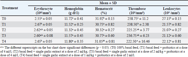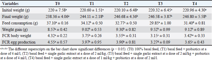 Data analysisThe information was gathered and analyzed using SPSS Version 22.0. The acquired data were subjected to analysis of variance with a 5% confidence level; if a significant difference was identified, the distance test by Duncan test was conducted. ResultsGrowth performanceThe following measures of the variable indicator can describe the growth performance condition of laying quail: body weight, initial weight, feed consumption, weight gain, feed conversion ratio of body weight, and feed conversion ratio of egg production. The measurements of growth indicators, such as more efficient feed consumption, showed that the treatment groups (T1, T2, T3, and T4) were significantly different from the control group (T0) (Table 2). The results showed that feed consumption in the combination treatment group of probiotics and single garlic extracts (T3, T4) had a high efficacy value compared to the single treatment group with probiotics and single garlic extracts (T1, T2), while the control group (T0) had the lowest value. The same conditions also occur when administering probiotics, extracts, and their combinations (T1, T2, T3, and T4), which can have a significant effect on final weight, feed conversion ratio (FCR) body weight, and FCR egg production in laying quail compared to the control group (T0). Hematology profileErythrocyte Research on quail blood samples revealed that the T0 treatment group significantly differed from T1 and T4, but not from T2 and T3. The T1 treatment group showed no significant difference from T4, but from T0. The T2 treatment group showed no significant difference but from T0, T1, and T3. The average number of erythrocytes based on the data obtained is still within normal standards. Hemoglobin The results of research on quail blood samples to see hemoglobin levels showed results that were not significantly different between treatment groups T0, T1, T2, T3, and T4. The average hemoglobin level based on the data obtained is still within normal standards. Hematocrit The study on quail blood samples revealed that the T0 treatment group was significantly different from T1, T2, and T3, while the T1 treatment group was not significantly different from T2, T3, and T4, but significantly different from T0. The average hematocrit level based on the data obtained is still within normal standards. Leukocyte Research on quail blood samples revealed significant differences in leukocyte levels between different treatment groups, with the T0 group showing the most significant differences. Treatment groups T1, T2, T3, and T4 showed no significant differences, but T0 showed the most significant differences. The average leukocyte level based on the data obtained is still within normal standards. Platelet Research on quail blood samples revealed significant differences in platelet levels between different treatment groups. The T0 treatment group showed significant differences from T1, T2, T3, and T4. The T1 treatment group showed no significant difference but was significantly different from T4 and T0. The average platelet level based on the data obtained is still within normal standards. Reproductive organsIn this study, probiotics, extracts, and their combinations (T1, T2, T3, and T4) could have more efficacy on reproductive organ morphology, such as length and weight morphology than the control group (T0). The statistical analysis’s results on reproductive organ weight, including vagina, uterus, oviduct, ovarium, and cloaca. Especially treatment group’s combinations of probiotics and single garlic extract (T3, T4) have a greater effect on the vagina and oviduct organs than other treatment groups (T1, T2). Table 2. Growth performance parameters of laying quail.