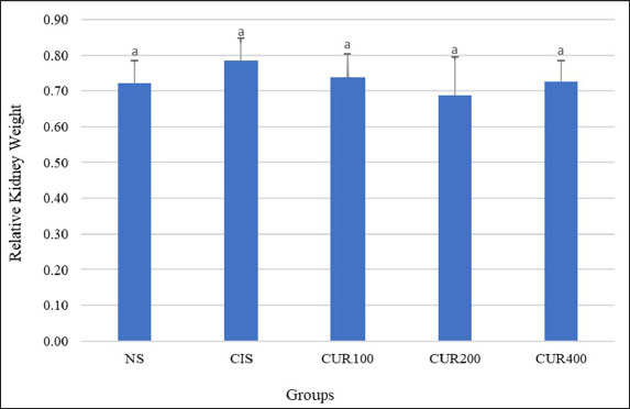 Fig. 3. The combined extracts of C. longa and zedoaria affect the relative kidney weight. Significant differences are indicated by bars with different superscript characters (p < 0.05). TNF-α, tumor necrosis factor alpha; KIM-1, kidney injury molecule 1; NS, normal control; CIS, cisplatin control; CUR100, extract100 + cisplatin; CUR200, extract200 + cisplatin, and CUR400 extract400 + cisplatin. qRT–PCR resultsTo evaluate and compare the results, qRT–PCR was performed by measuring changes in the gene expression cycle thresholds of TNF-α, KIM-1, and caspase 3. The results showed that the CIS group exhibited an increased mRNA expression of these markers compared with the NS group. However, as shown in Fig. 5A–C, the groups treated with the combined extract of C. longa and C. zedoaria showed significantly reduced expression levels, with the most pronounced decreases observed in the CUR200 and CUR400 groups. DiscussionThis study investigated the potential protective effects of combined C. longa and C. zedoaria extracts on rat kidneys against CIS-induced damage. This investigation focused on examining TNF-α, KIM-1, and caspase 3 markers to assess the efficacy of this herbal combination in mitigating the adverse renal effects of CIS. A pathophysiological diagram illustrates the primary molecular mechanisms involved in CIS-induced kidney damage (Fig. 1). The combined extract was administered in multiple doses for 20 days in a row, with the first dose of CIS administered on the seventh day and subsequent intraperitoneal injection of CIS (1 mg/kg) administered 1 week later.