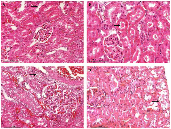 Fig. 4. Photomicrographs of H&E-stained kidney sections from rats treated with C. longa and C. zedoaria extracts after CIS-induced nephrotoxicity. (A). Enlarged tubules with thinning of the epithelial cell layer (black arrow), (B) hyaline casts (black arrow), (C) cellular degradation (black arrow) characterized by fluid-filled spaces, and (D) localized tubular necrosis (black arrow). Bars=75 μ. The administration of C. longa and C. zedoaria resulted in BW fluctuations, with an overall upward trend observed at the end of the experiment. However, the NS group exhibited continuous weight gain throughout the study period. In contrast, the CIS group consistently decreased in weight every week until the end of the experiment (Fig. 2). These results are consistent with those of previous studies in which repeated i.p. administration of CIS 1 mg was associated with weight loss, reduced kidney weight, and increased kidney weight/BW ratio (El-Waseif et al., 2022). Changes in organ and BW are commonly used to indicate potential harmful effects in toxicological studies (Shafaei et al., 2015). Decreased renal tubular cell counts may contribute to decreased BW (Basile et al., 2012). The capacity of the manifold to absorb water may be diminished by renal tubular cell necrosis, which increases the amount of fluid lost in urine (Corman et al., 1981). By identifying inflammatory mediators such as TNF-α, CIS causes an inflammatory response in kidney tubular cells, as shown in both in vivo and in vitro studies (Domitrović et al., 2013; Teng et al., 2015). Studies have demonstrated the important roles of renal cell apoptosis and programmed cell death in CIS-induced acute kidney damage (Jin et al., 2020). Our findings revealed high TNF-α, KIM-1, and caspase 3 expression in the CIS group. At the same time, the administration of 200 mg/kg BW after two injections of CIS administered 7 days apart reduced the expression of TNF-α, caspase 3, and KIM-1, as the combined extract of C. longa and C. zedoaria effectively countered these changes. The results align with previous research demonstrating that TNF-α plays a crucial role in tubulointerstitial injury, CIS-induced nephrotoxicity, acute kidney injury (AKI), and chronic kidney disease in animal models, which is associated with elevated levels of TNF-α (Ramesh and Brian Reeves, 2002; Pabla and Dong, 2008; El-Waseif et al., 2022; Widowati et al., 2022). The well-known anti-inflammatory properties of the combined extract components may explain why the combined extract of C. longa and C. zedoaria fully or partially restored TNF-α levels to baseline (Pan et al., 2019). Renal epithelial cells, rather than immune cells, can generate TNF-α in urine and blood after CIS treatment. TNF-α also produces reactive oxygen species, triggering nuclear factor kappa light-chain enhancer of activated B cells (NF-κB) (Zhang et al., 2007). Subsequently, this transcription factor produces pro-inflammatory cytokines, such as TNF-α. TNF-α is essential for nephrotoxicity caused by CIS (Ramesh and Brian Reeves, 2002).