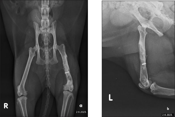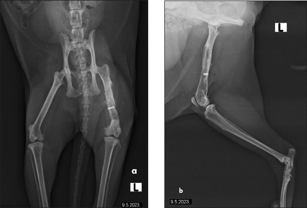 Fig. 4. The radiographs of a cat’s left femur show (a) a ventrodorsal and (b) a mediolateral view demonstrating the femur after 1 month of LT, demonstrating reduced medullary transparency and early signs of bone consolidation. Various clinical approaches have been explored to stimulate and accelerate bone healing, including physical stimulation, chemical treatments, and photostimulation. Photobiomodulation, the scientific term for LT, describes a photochemical process where light interacts with cells, triggering biochemical changes. The term is preferred as it reflects that some cellular processes are upregulated while others are downregulated. Numerous studies have examined photobiomodulation, many focusing on its cellular effects in vitro. Research highlights include increased angiogenesis, neurite extension, ion channel normalization, and cellular membrane stabilization. Moreover, LT promotes osteogenesis; both in vitro and in vivo studies demonstrate enhanced osteoblast proliferation, survival, and metabolism. The exact mechanisms behind photobiomodulation remain debated. Likely, multiple mechanisms exist depending on the target and cell type. The most recognized is the cytochrome c pathway in mitochondria, where cytochrome c, acting as a photoreceptor, absorbs light (500–1,100 nm). This excitation breaks nitric oxide bonds, enabling oxygen bonding and optimizing cytochrome c oxidase production. This enzyme is crucial for ATP formation, essential for cellular energy. The resulting ATP boosts secondary biological effects such as pain reduction, inflammation control, and tissue healing. LT also stimulates alkaline phosphatase activity and osteopontin, a protein crucial for osteoclast attachment to the mineralized bone matrix. Clinically, this leads to improved calcification and accelerated fracture healing.