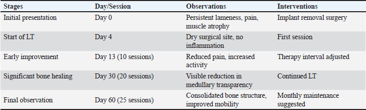 Fig. 1. Timeline of interventions and treatments in feline femoral surgery rehabilitation. The owner reported continuous improvement, noting that the cat is increasingly bearing weight on the left hind limb, showing fewer signs of pain, and displaying an improved disposition. Follow-up radiographs revealed improvement in the condition of the femur post-therapy (Fig. 4). There is a noticeable improvement in bone structure, indicating enhanced healing and remodeling processes. After 2 months of intensive therapy and visible clinical improvement, the intervals between treatments were further extended. The radiograph shows the bone structure to be more consolidated, indicating effective recovery and remodeling (Fig. 5). Overall, the imaging suggests a positive outcome following treatment. In agreement with the owner, the treatments have continued on a monthly basis, and the cat continues to show progress. To better illustrate the progression of the cat’s recovery, Table 1 summarizes the key clinical observations and treatment stages throughout the LT rehabilitation process. DiscussionBone regeneration is typically an efficient physiological process; however, the presence of bone defects can significantly hinder this process. Additionally, factors such as pathological fractures, infections, inadequate blood supply, or systemic diseases can further complicate healing (Berni et al., 2023). Orthopedic implant failure is characterized by either a failure at the bone–implant interface, leading to loosening and instability of the fracture, or mechanical issues, such as bending or breakage of the implant. This failure can result from mechanical factors related to load on the construct, biological factors affecting bone healing, or a combination of both (Menghini et al., 2023). The research conducted by Menghini et al. (2023) found that the mechanical failure of implants raises the likelihood of delayed or abnormal fracture healing. Bone regeneration typically involves a combination of intramembranous and endochondral ossification, where progenitor cells differentiate into chondroblasts and osteoblasts. Over several weeks, the fibrocartilaginous callus is progressively replaced by a more organized, calcified, and stable callus. This callus is then remodeled over the following months, adapting to stress forces, until it closely resembles normal bone.