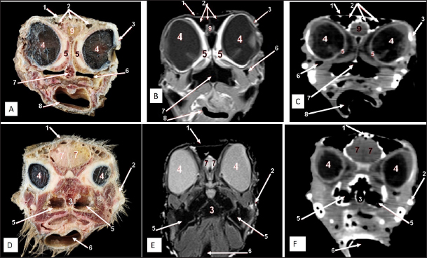 Fig. 9. Rostral-caudal cross sections of the adult ostrich head—level 4. Rostral views of A) photograph of an anatomical cross section, B) MRI and C) computed tomography images showing: 1- Os frontalis, 2- Frontal sinus, 3- Processus quadratojugale, 4- Eye ball, 5- Pars verticalis ethmoidale, 6- Infra orbital sinus, 7- Vomer, 8- Tracheal lumen surrounded by tracheal cartilaginous rings, 9- Sagittal eminence (wulst) of the cerebrum. Caudal views of D) an anatomical cross section, E) MRI and F) computed tomography images showing: 1- Os frontalis, 2- Processus. quadratojugale, 3- Vomer, 4- Eye ball, 5- Infra orbital sinus, 6- Trachea, 7- Cerebral hemispheres of the brain.