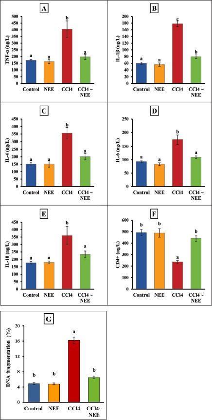 Fig. 5. Serum TNF-α, IL1β, IL-4, IL-6, IL-10 and CD4 levels as well as kidney DNA fragmentation of control, CCl4-intoxicated and NEEtreated male albino rats A–G. Data are presented as Mean ± SD using one-way ANOVA and a post hoc test (Duncan) at p ≤ 0.05. Columns sharing the same symbol are not significant.