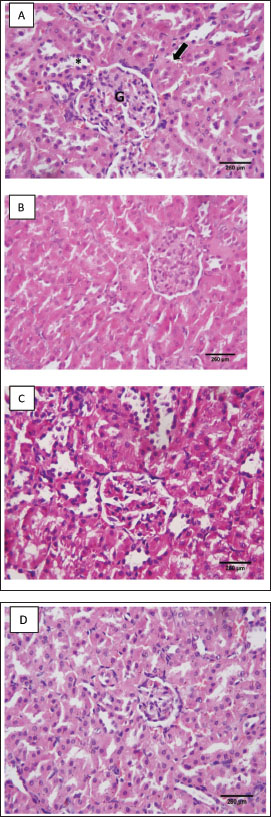 Fig. 6. (A–D). A histopathological analysis of the groups’ renal tissues. Photomicrograph of the control group’s renal tissue in (A) demonstrates the healthy renal cortical structure with glomeruli (*), proximal convoluted tubules (arrow), and distal convoluted tubules (long arrow); (B) Approximately typical renal cortical structure with glomeruli, proximal convoluted tubules, and distal convoluted tubules can be seen in the photomicrograph of renal tissue taken from the NEE group; (C) photomicrograph of the treated group’s renal tissue reveals aberrant renal cortical structure, including atrophied glomeruli, obliterated proximal convoluted tubules in some locations, and others with atypical architecture (D) A photomicrograph of the CCl4 and NEE group’s renal tissue reveals enhanced cortical nephron structure, including glomeruli, PCT, and DCT, as well as modest arteriolar congestion. Immunohistochemistry:Caspase-3’s sporadic expression was found in the renal tissue of the control group (Fig. 7a) and NEE group (Fig. 7b). In the CCl4 group, caspase-3 displayed a strong expression (Fig. 7c). The CCl4 and NEE – treated group showed moderate Caspase-3 expression when compared with CCl4 group (Fig. 7d). DiscussionOne of the many environmental toxins linked to various types of harmful cellular damage in various human organs is CCl4 (Marie et al., 2022). CCl4 is utilized to cause organ toxicity in experimental animal models, including hepatotoxicity, nephrotoxicity, and cardiotoxicity (Ashry et al., 2021). The toxicity of CCl4 was attributed to its metabolic activation by the P450 system, which produces the extremely reactive free radicals trichloromethyl and chloride radicals. These radicals damage DNA and cause protein peroxidation because of their strong affinity to bind to organ tissue electrons (Alkreathy et al., 2014). It was once believed that renal impairment brought on by CCl4 medication might occur without being influenced by the functional condition of the liver (Rincón et al., 1999). Furthermore, it has been observed that renal tissue disperses CCl4 far more than hepatic tissue (Sanzgiri and Bruckner, 1997). In a prior study, oxidative stress brought on by CCl4 was blamed for the nephrotoxicity in rats (Abraham et al., 1999). It was also asserted that exposure to CCl4 led to kidney damage by creating reactive oxygen species (Ganie et al., 2011). The current study’s primary goal was to investigate if NEE could protect rats from CCl4-induced nephrotoxicity. Our results revealed that injection of CCl4 significantly elevated serum urea, creatinine, uric acid, K+, and urea nitrogen matched with decreased Na+ and Ca+, which is the kidney removing them from the blood as a nitrogenous product of metabolism. After receiving CCl4, this function was compromised, and the amount of creatinine excreted from the blood was decreased, as shown by the noticeably elevated quantity in the blood. The results are consistent with past research written about in the literature (Marie et al., 2022; Nomier et al., 2022; Habashy and Abu-Serie, 2024). One potential reason is nephron structural integrity degradation (Marie et al., 2022). The CCl4 group also displayed significant cytoplasmic vacuolation and pyknosis of their tiny, very basophilic nuclei, and had a measurable enlargement of the epithelial lining of the renal tubules. Serum urea, creatinine, uric acid, and urea nitrogen levels were significantly reduced as a result of the concurrent delivery of NEE. N. sativa’s antioxidant activity may be responsible for this reduction, which lowers the ROS burden by quenching free radicals. It has been discovered that CCl4 increases the production of free radicals in the tissues of the liver, kidney, brain, and lungs (Alkreathy et al., 2014). lipid peroxidation, protein denaturation, and cell death are all caused by these free radicals (Hismiogullari et al., 2015). Important oxidative stress evaluation indicators include lipid peroxidation and GSH (Shahsavari et al., 2017). Glutathione, a naturally occurring antioxidant, guards against cellular harm by removing free radicals and lipid peroxides (Jaswal et al., 2003).