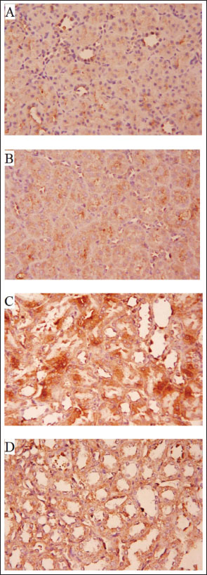 Fig. 7. (A–D) Photomicrographs of Caspase-3- immunostained renal tissues from several groups (x400). (A): The typical, modest cytoplasmic Caspase-3 IHC positivity was present in the control group of rats. (B): NEE group displaying cytoplasmic light Positive Caspase-3 IHC result. (C) Caspase-3 immuno-reactivity was severely exhibited in the CCl4 treated group. (D): Moderate Caspase-3 IHC positivity in the CCl4 and NEE-treated group.