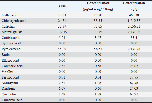 Fig. 2. HPLC analysis of phenolic constituents of Nigella sativa ethanolic extract. Table 1. Using HPLC analysis, phenolic components of the ethanolic extract of Nigella sativa.