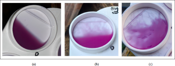 Fig. .1 Results of mastitis diagnosis with the CMT reagent: (a) negative subclinical mastitis result; (b) positive subclinical mastitis 2+ result; (c) positive subclinical mastitis 3+ result.