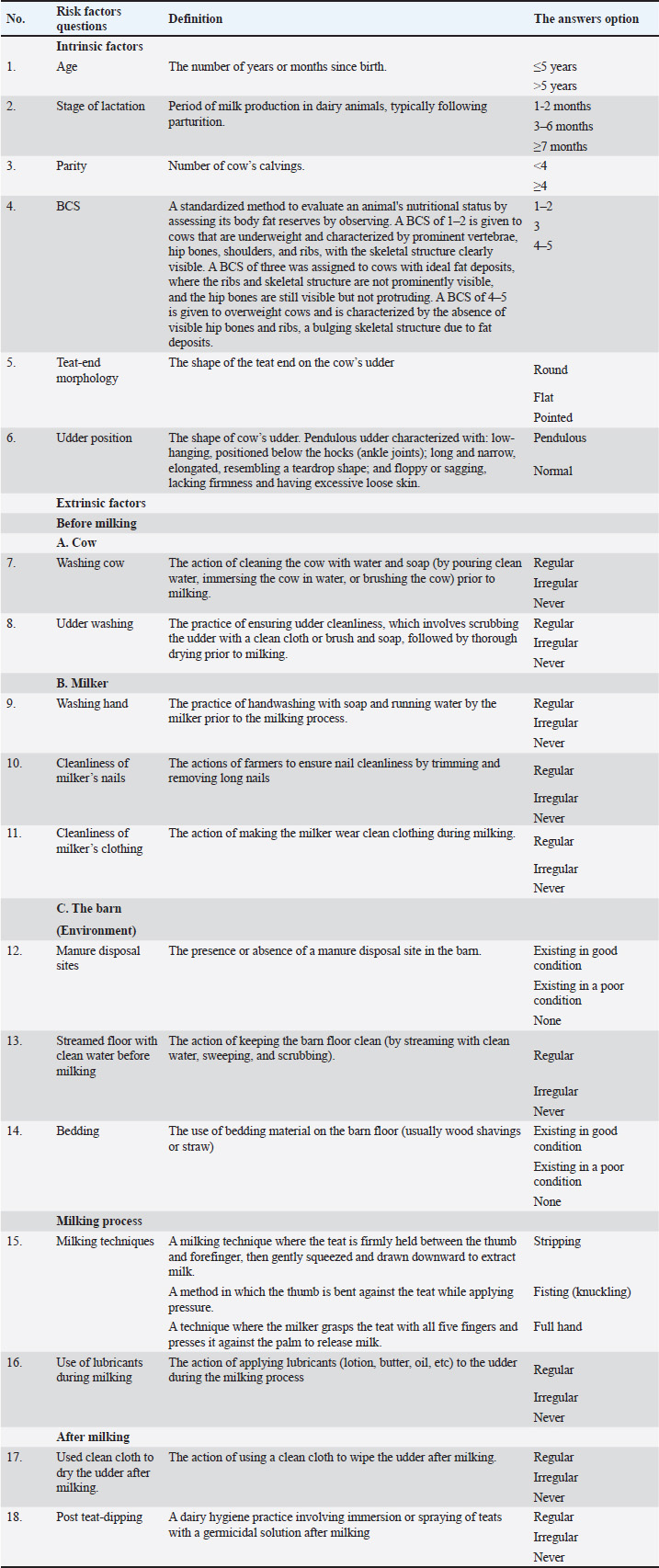 nadj=45 The final sample size was determined to be 45 farmers, with each farmer contributing one lactating cow as a sample unit. Data collectionThe research includes visual observation of the cow’s udder, milk sampling, identification of mastitis with the California Mastitis Test (CMT), data collection regarding risk factors with questionnaires administered to farmers, and direct observations during the milking process. A structured questionnaire with close-ended questions was used to collect data on the various risk factors associated with the occurrence of mastitis in dairy cows (Table 1). The intrinsic factors included age, stage of lactation, parity, Body Condition Score (BCS), teat end morphology, and udder position. Extrinsic factors include washing cow before milking, udder washing before milking, washing hands before milking, cleanliness of the milker’s nails, cleanliness of the milker’s clothing, manure disposal sites, streamed floor with clean water before milking, bedding, milking techniques, use of lubricants during milking, use of a clean cloth to dry the udder after milking, and post-teat dipping. Diagnosis of mastitisIn this study, the udder and teats of lactating cows were clinically examined for abnormalities prior to milk sample collection. Clinical mastitis was identified by signs of udder inflammation, including swelling, redness, heat, hardness, and a painful response upon palpation, as well as decreased udder function. Additional indicators of clinical mastitis included the presence of clots, flakes, blood, and other changes in milk consistency, along with observable morphological changes in the udder and teats. The CMT was used to screen cows with subclinical mastitis. Milk samples were collected directly from each teat. The CMT reagent was then added to the milk sample at a 1:1 ratio. The filled paddle was gently rotated horizontally for 10–15 seconds, after which the sample was observed to diagnose subclinical mastitis. The test results were subjectively interpreted as negative, +1, +2, or +3. A negative result was observed for milk that remained clear without streaking or sediment. A +1 result (mild positive) indicates milk with streaks. A +2 result was obtained for milk with a consistency that began to form clumps that resembled mucus. A +3 result was obtained for milk with a gel-like, agar-like structure. Data management and analysisThe prevalence of mastitis was calculated as the proportion of mastitis-positive cows by CMT test or cows showing symptoms of clinical mastitis to the total number of examined cows. The data analysis regarding risk factors was conducted using IBM SPSS Statistics software, and bivariate analysis was performed. In this study, the statistical test used was the Chi-square test (Tezera and Ali, 2021), which was conducted to determine whether a correlation existed between two variables: data on the risk factor variable group as the independent variable (age, stage of lactation, parity, BCS, teat end morphology, udder position, washing cow before milking, udder washing before milking, washing hands before milking, cleanliness of milker’s nails, cleanliness of milker’s clothing, manure disposal sites, streamed floor with clean water before milking, bedding, milking techniques, used lubricants during milking, used clean cloth to dry udder after milking, and post teat dipping) and the prevalence of mastitis as the dependent variable. Data were analyzed with a 95% confidence interval with an α of 5%, if the p-value ≤ 0.05, the statistical calculation results are significant or indicate a correlation between the independent variable and the dependent variable. If the p-value is >0.05, the statistical calculation results indicate no correlation between the independent and dependent variables. Followed logistic regression analysis with a 95% confidence interval to determine the risk of each category in the risk factor variable. Table 1. Feed formulation and proximate chemical composition of the basal diet (on a DM basis).