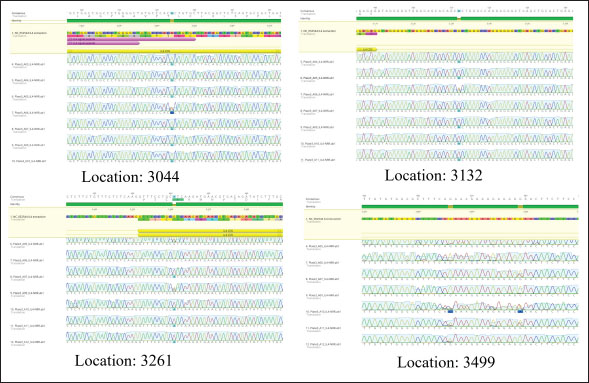 Fig. 3. Genetic variants at multiple locations within the amplified area of the ChIL4 gene. Table 4. Genotype analysis at different locations in ChIL4 gene for the three groups.