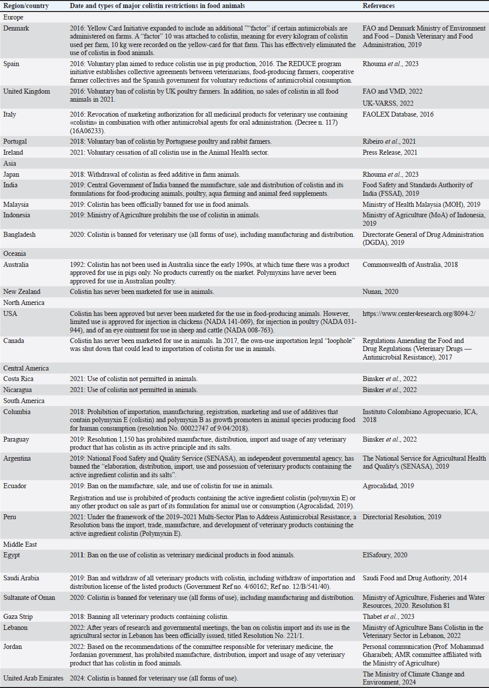AbstractColistin (polymyxin E) is a former exclusive veterinary antimicrobial and one of the oldest antibiotics that is currently recognized as one of the highest priority and critically important antimicrobials for human medicine. For food animals, colistin is extensively used for multiple medical and nonmedical purposes, particularly for growth promotion, prophylaxis/metaphylaxis, and therapeutic purposes. As a result, colistin resistance is widespread along the food chain and is linked to multidrug-resistant bacterial infections in humans. Furthermore, human medicine is more reliant on colistin for serious infections in healthcare settings. As a result, different types of national bans/restrictions in food- producing animals have been implemented around the world. Conclusions: The testimonies of 29 countries representing global initiatives to phase-out colistin use in animal production. Keywords: Colistin (polymyxin E), Global public health, Food producing animals IntroductionOne of the oldest and previous veterinary-exclusive antibiotics, colistin (also known as Polymyxin E) is now considered one of the most significant and high- priority antibiotics for human medicine. For food animals, colistin is extensively used for several medical and nonmedical purposes, including prophylaxis/ metaphylaxis, growth promotion, and therapeutic purposes (Ortwine et al., 2015). Colistin is one of the most significant and high-priority antimicrobials, according to the World Health Organization. However, the World Organization for Animal Health (formerly known as the Office International des Epizooties (OIE) has never declared that colistin is critically important for animals. Over the past decades, the rapid global dissemination of colistin resistance has been documented in bacteria originating from animals and humans (Ali et al., 2024). Additionally, resistance to colistin was reported throughout the food chain and is linked to human clinical infections, including the environment, food- producing animals, retail meat, and asymptomatic individuals and patients whom have never been exposed to colistin, particularly young children (Peñalva et al., 2022). Following the initial reports of mobilized colistin resistance (mcr) genes conferring plasmid- mediated resistance to colistin (i.e., mcr-1 gene) in Escherichia coli in China, different variants of this gene and other numerous subvariants of mcr-2 to mcr- 10 have been reported (Shen et al., 2020; Sharma et al., 2022; Ali et al., 2024). The phylogeny and spread of mcr-1˜10 genes and variants vary greatly, suggesting different evolutionary advantages worldwide (Li et al., 2021). A major public health concern is the increased global spread of antimicrobial resistance among various bacterial species, including zoonotic pathogens, which is facilitated by the higher prevalence of mobile mcr genes among animal bacterial isolates and the significantly higher consumption of colistin in livestock compared to human medicine in several countries (Binsker et al., 2022; Tokuda et al., 2024). On the other hand, a number of independent studies have demonstrated that drastic reductions of colistin use for food-producing animals—rather than in human medicine—have resulted in significant reduction in colistin-resistant bacteria in both food-producing animals and humans, including both asymptomatic human carriers and infected individuals (Fournier et al., 2020; Shen et al., 2020; Wang et al., 2020; Dierikx et al., 2022; Khine et al., 2022). For the majority of food-producing animal species, colistin is marketed in the European Union (EU) as a “Treatment and metaphylaxis of enteric infections caused by non-invasive E. coli susceptible to colistin sulphate.” In some non-EU regions, colistin is marketed for the treatment of Salmonella and colibacillosis in animals used for food production. Minor applications of various polymyxins for ear and eye infections in pets can be administered alone or in combination with other antibiotics. In horses/foals, off-label uses of human polymyxin B intravenous formulations are given at sub-therapeutic concentrations for endotoxemia. In human medicine, the critical need for colistin as a last-resort therapy is becoming increasingly needed. The use of colistin to treat infections caused by carbapenem-resistant Enterobacterales, multidrug- resistant (MDR)-Acinetobacter spp., MDR-Klebsiella spp., and MDR-Pseudomonas spp. is on the rise in hospitals and intensive care units (Ortwine et al., 2015). Infections by MDR Gram-negative bacteria are a growing threat to global healthcare, as reflected by greater use of colistin in hospitals/ICUs for the treatment of infections caused by carbapenem- resistant Enterobacterales, MDR-Acinetobacter spp., MDR-Klebsiella spp., and MDR-Pseudomonas spp. (Ortwine et al., 2015). Colistin is also increasingly administered via inhalation for the treatment of infections in patients with cystic fibrosis and ventilator- associated pneumonia. With an estimated 2,500 deaths (EU/EEA regions) linked to colistin-resistant Gram- negative bacteria in 2015, infections by carbapenem- resistant Gram-negative bacteria were linked to high mortalities (Cassini et al., 2019). MDR-Acinetobacter species and MDR-Klebsiella pneumonia are also reported from human clinical samples from developing countries expressing colistin resistance-carbapenemase producing phenotypes (Kieffer et al., 2018). These major concerns about agriculture colistin use have resulted in various national decisions on types of colistin bans/restrictions in food-producing animals. Several countries have taken the final decision to not allow colistin for all types of use, including therapeutic, for major food-producing animal populations. Some countries have banned colistin for use as growth promoters (feed additives), including Brazil, Chile, Uruguay, China, Japan, South Korea, Nepal, South Africa, and Vietnam. Thailand has gone a step further by further pr