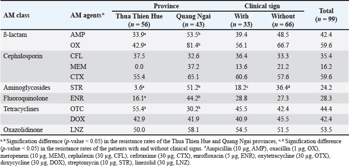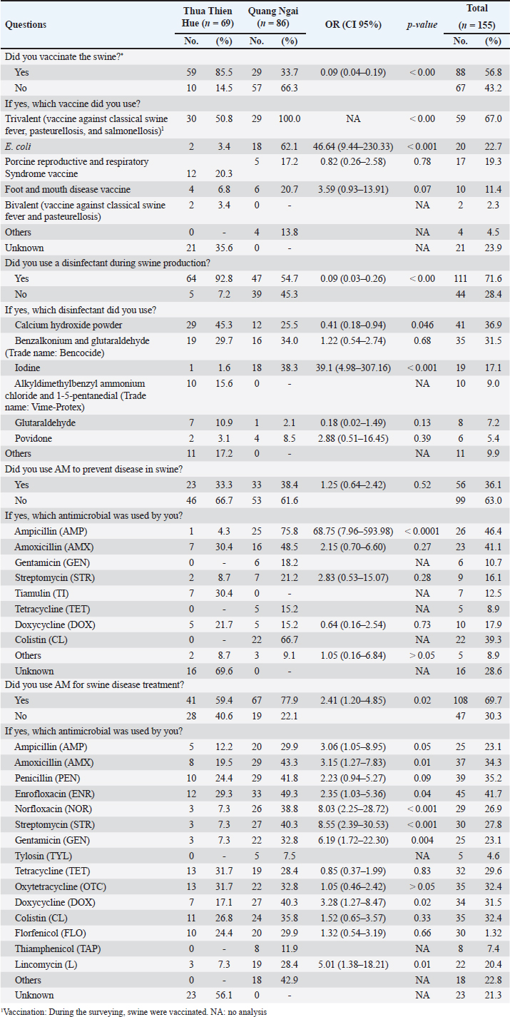 Antimicrobial use is generally accepted as the main driver of AMR, and the relationship between AMU and AMR in animals is, therefore, a topic of considerable interest (Holmer et al., 2019; Jibril et al., 2021; Sali et al., 2021). Our investigation revealed significant associations between AMU (in both prevention and treatment) and the presence of certain AMR phenotypes. The AMR phenotype is common among E. coli indicators isolated from swine in the United States (Spronk et al., 2023) and European countries (EFSA, 2021). Similar to the findings of Kobayashi et al. (2023), the results of this study showed that AMU was associated with resistance not only to AMs belonging to the same AM class (AMX and AMP; GEN and STR) but also to AMs from other classes (AMX and ENR; FLO and DOX). Resistance genes occurring in the same mobile genetic elements and gene cassettes (Birkegård et al., 2017; Partridge et al., 2018) may explain the observed AMR phenotypes and should be addressed in more detail in future investigations. However, not all associations between AMU and AMR phenotypes in this study could be explained. For example, the use of LNZ, STR, and NOR (as treatment) was negatively associated with the presence of the OTC phenotype. In other studies, both corresponding and divergent associations between AMU and AMR, including direct and implicit resistance selection mechanisms, have been reported (Callens et al., 2015; Makita et al., 2016). Makita et al. (2016) suggested that these issues were due to natural, cross- or co-selection based on analyses of AMR in E. coli isolates from swine and AMU. ConclusionSmallholder swine farmers in the two provinces used several essential veterinary drugs (including disinfectants, vaccines, and AMs) on their farms for prevention and treatment. The S. aureus isolates from swine included those from healthy swine that threatened public and animal health. Resistance to some AMs in S. aureus isolates was associated with the use of vaccines, disinfectants, and corresponding AMs, implying that increasing the use of such AMs would increase resistance. These results should help establish countermeasures against AMR in S aureus in smallholder swine farms in Central Vietnam. The findings provide support only for analyses conducted at a single time point: on-farm veterinary drug usage is associated with on-farm AMR. Other complex multifactorial relationships may contribute to the selection of AMR bacteria, which we hope to investigate further in future studies. AcknowledgmentThe authors would like to thank Mr. Hoang Dinh Quoc, who helped us with sampling. We also thank the farmers in Quang Ngai and Hue provinces, who participated in the interviews, provided honest information, and allowed sampling from their pigs. Conflict of interestThe authors declare that they have no conflicts of interest regarding any financial, personal, or other relationships with individuals or organizations related to the material discussed in this manuscript. FundingThis work was supported by a Hue University-level research project (No. DHH2023-02-176. The authors are grateful to the president of Hue University for allowing them to conduct this study. Authors’ contributionsAll authors contributed to the study’s conception and design. Nguyen Van Chao developed the original hypotheses, designed the experiments, and collaborated in interpreting the results. Ho Thi Dung, Bui Thi Hien, and Vu Thi Thanh Tam collected the data for this study, conducted the statistical analyses, and collaborated in the interpretation of the results. Ho Thi Dung, Vu Thi Thanh Tam, Phan Thi Hang, and Bui Thi Hien collaborated in interpreting the results and finalized the manuscript. All authors have read and approved the finalized manuscript. Data availabilityData supporting the findings of this study are available from the corresponding author under the Project funding, upon reasonable request. ReferencesAbreu, R., Rodríguez-Álvarez, C., Lecuona, M., Castro, B., González, J.C., Aguirre-Jaime, A. and Arias, Á. 2019. Increased antimicrobial resistance of MRSA strains isolated from pigs in Spain between 2009 and 2018. Vet. Sci. 6(2), 38. Adesoji, A.T., Onuh, J.P., Bagu, J. and Itohan, S.A. 2019. Prevalence and antibiogram study of Staphylococcus aureus isolated from clinical and selected drinking water of Dutsin-Ma, Katsina state, Nigeria. Afr. Health Sci. 19(1), 1385–1392. Asai, T., Kojima, A., Harada, K., Ishihara, K., Takahashi, T. and Tamura, Y. 2005. Correlation between the usage volume of veterinary therapeutic antimicrobials and resistance in Escherichia coli isolated from the feces of food-producing animals in Japan. Jpn. J. Infect. Dis. 58(6), 369–372. Auplish, A., Vu, T.T.T., Pham Duc, P., Green, A., Tiwari, H., Housen, T., Stevenson, M.A. and Dhand, N. 2024. Capacity and needs assessment of veterinary services in Vietnam in biosecurity, biosafety and One Health. PLoS One 19(1), e0295898. Bak, H. and Rathkjen, P.H. 2009. Reduced use of antimicrobials after vaccination of pigs against porcine proliferative enteropathy in a Danish SPF herd. Acta Vet. Scand. 51(1), 1. Basiry, D., Entezari Heravi, N., Uluseker, C., Kaster, K.M., Kommedal, R. and Pala-Ozkok, I. 2022. The effect of disinfectants and antiseptics on co- and cross-selection of resistance to antibiotics in aquatic environments and wastewater treatment plants. Front Microbiol 13(1), 1. Birkegård, A.C., Halasa, T., Græsbøll, K., Clasen, J., Folkesson, A. and Toft, N. 2017. Association between selected antimicrobial resistance genes and antimicrobial exposure in Danish pig farms. Sci. Rep. 7(1), 9683. Bischofberger, A.M., Baumgartner, M., Pfrunder-Cardozo, K.R., Allen, R.C. and Hall, A.R. 2020. Associations between sensitivity to antibiotics, disinfectants and heavy metals in natural, clinical and laboratory isolates of Escherichia coli. Environ. Microbiol. 22(7), 2664–2679. Blanco, P., Hernando-Amado, S., Reales-Calderon, J.A., Corona, F., Lira