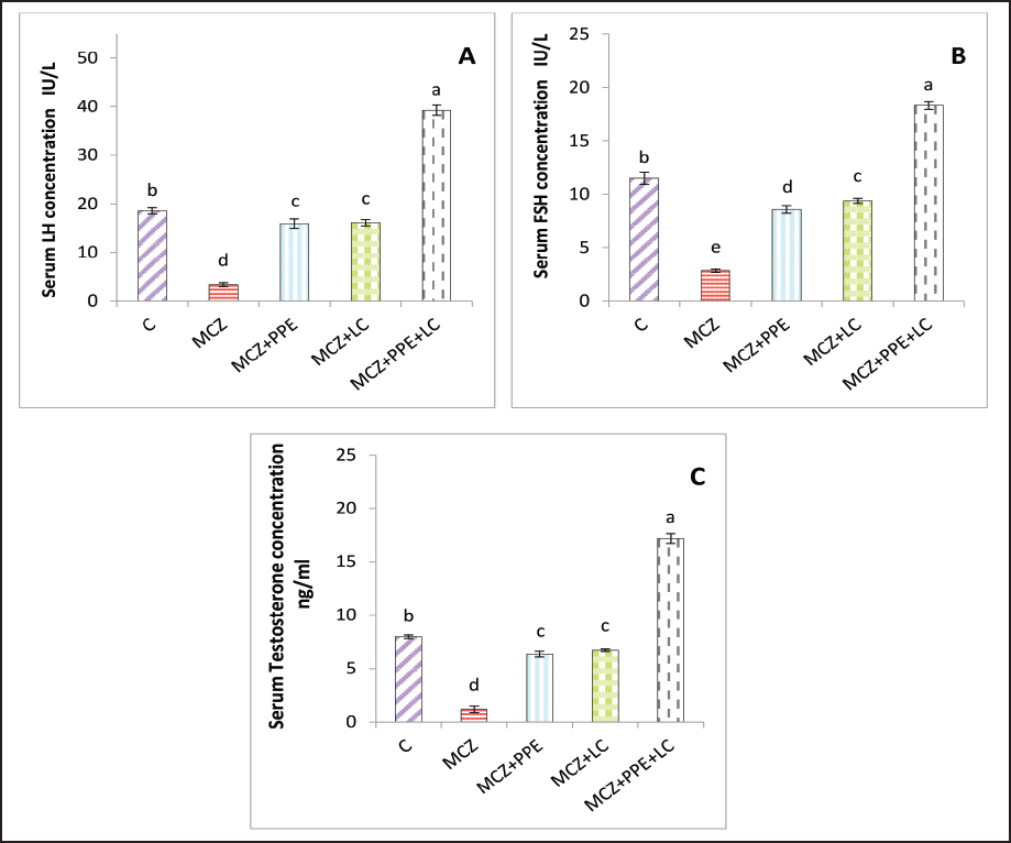 Fig. 2. Serum reproductive hormone levels in rats. (A) serum concentrations of luteinizing hormone (LH), (B) serum concentrations of follicle-stimulating hormone (FSH), and (C) serum concentrations of testosterone. The different letters represent significant differences among groups at p < 0.05. C: control rats received distilled water, MCZ: rats received (313.6 mg/Kg/day) of mancozeb. MCZ+PPE: rats received (313.6 mg/Kg/day) of mancozeb and (40 mg/Kg/day) of Pinus pinaster extract. MCZ+LC: rats received (313.6 mg/Kg/day) of mancozeb and (200 mg/Kg/day) of L. carnitine. MCZ+PPE+LC: rats received (313.6 mg/Kg/day) of mancozeb, (40 mg/Kg/day) of Pinus pinaster extract, and (200 mg/Kg/day) of L. carnitine. Comparative effects of P. pinaster Extract and L. carnitine on seminal analysis quality in response to mancozeb-induced reprotoxicity in adult male ratsTable 2 shows the effects of P. pinaster extract and L. carnitine on the seminal quality of rats exposed -to mancozeb. The semen count, sperm motility, and viability were significantly increased (p < 0.05) in the MCZ+PPE+LC males compared with all experimental rats, whereas they were significantly reduced in the MCZ-treated male rats compared with all experimental rats. Sperm count, motility, and viability were significantly elevated (p < 0.05) in MCZ+PPE males and MCZ+LC males compared with MCZ-treated rats and control rats, Table 2. The statistical analysis of sperm abnormality results in MCZ males revealed a significant elevation (p < 0.05) compared with all experimental rats. It was significantly reduced (p < 0.05) in MCZ+PPE+LC males compared with that in all treated rats. The sperm abnormalities of MCZ+PPE and MCZ+LC males registered a significant decrement (p < 0.05) compared with the control and MCZ males, Table 2. Comparative effects of P. pinaster Extract and L. carnitine on histological changes in response to mancozeb-induced reprotoxicity in adult male ratsHistological sections of the testes of mancozeb-treated rats showed necrosis and atrophy in the seminiferous tubules, distributed vacuolation among spermatogenic cells resulting from exfoliation germ cells, empty lumens from spermatozoa, and degeneration spermatogenic cells. Additionally, mancozeb caused germinal layer disintegration and interstitial space widening accompanied by loss of the quantities of interstitial cells (Figure 4B) compared with control rats that showed a typical histological appearance of Leydig cells and Sertoli cells with different stages of spermatogenesis (Figure 4A). Whereas the testicular section of either P. pinaster extract or L. carnitine-mancozeb-treated rats showed mild spermatogenic degeneration and normal architecture of Sertoli and Leydig cells, seminiferous tubules accompanied with the series stages of development of spermatogonia, spermatocytes, spermatid, and spermatozoa (Figure 4C, and D), while the testicular-histological sections of rats that received both P. pinaster extract or L. carnitine after being exposed to mancozeb showed a normal structure, same as that of control rats as normal germinal epithelia, typical spermatogenic cells with normal Sertoli and Leydig cells, seminiferous tubules filled with primary and secondary spermatocytes, spermatid, and spermatozoa (Figure 4E).