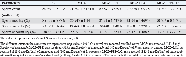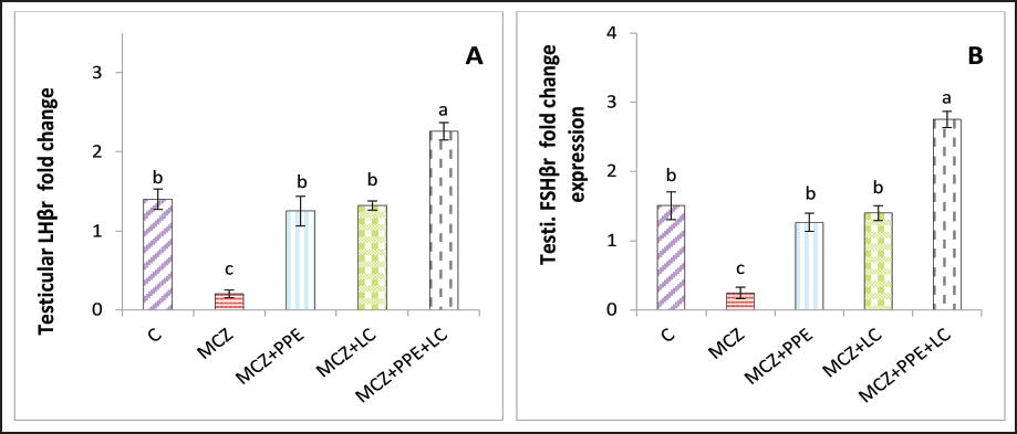 Fig. 3. The testicular fold change of male experimental rats. (A) testicular fold change of LHβr gene, and (B) testicular fold change of FSHβr gene. The different letters represent significant differences among groups at p < 0.05. C: control rats received distilled water, MCZ: rats received (313.6 mg/Kg/day) of mancozeb. MCZ+PPE: rats received (313.6 mg/Kg/day) of mancozeb and (40 mg/Kg/day) of Pinus pinaster extract. MCZ+LC: rats received (313.6 mg/Kg/day) of mancozeb and (200 mg/Kg/day) of L. carnitine. MCZ+PPE+LC: rats received (313.6 mg/Kg/day) of mancozeb, (40 mg/Kg/day) of Pinus pinaster extract, and (200 mg/Kg/day) of L. carnitine. Table 2. The effects of Pinus pinaster extract and L. carnitine on the seminal quality of male rats exposed to mancozeb.