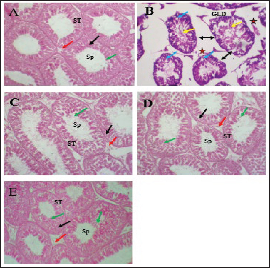 Fig. 4. Testicular-histological section of all experimental rats. (A) The testicular section of control rats showed a normal structure of interstitial cells, Sertoli cells, and seminiferous tubules with different stages of spermatogenesis. (B) The testicular sections of mancozeb-treated rats showed germinal layer degeneration (GLD), loss of interstitial cells (star), vacuolation among spermatogenic cells (blue arrow), widening the spaces among seminiferous tubules (bidirectional black arrow), and necrosis of seminiferous tubules (yellow arrow). (C) The testicular sections of P. pinaster extract-mancozebtreated rats showed that the germinal epithelia, Sertoli cells, interstitial cells, and seminiferous tubules return to the normal architecture with various phases of spermatogenesis. (D) The testicular section of L. carnitine-mancozeb-treated rats showed a normal structure as that of control rats. (E) Histologicaltesticular sections of both P. pinaster extract- and L. carnitine-mancozeb-treated rats showed that the seminiferous tubules returned to normal architecture. Hematoxylin and Eosin (H&E); 400X. The antioxidant role of PPE had been previously demonstrated (Atta et al., 2020), which were confirmed in the current results, whereby reduction in MDA and enhancement in the activities of superoxide dismutase and glutathione peroxidase in PPE co-administration to mancozeb-treated rats, which contributed to their biological components from procyanidin, quercetin, zinc, kaempferol, tricin, vitamin C and E (Singh et al., 2021; J. Bayer and P. Högger, 2024), which have potent antioxidant properties that protect cellular DNA and membranes against ROS, RNS, and oxidative damage (Liu et al., 2024). Besides, the statistical analysis of the current data revealed that there was a valuable enhancement in the antioxidant activities with reduced lipid peroxidation in L. carnitine co-exposure to mancozeb-treated rats, which was attributed to the ability of L. carnitine to scavenge free radicals and prevent the testicular oxidative stress (Salem et al., 2021). The present results of MNZ + LC-treated rats are in accordance with the findings (Abdel-Emam and Ahmed, 2021), who concluded that L. carnitine could reduce oxidative stress via diminished lipid peroxidation and improve antioxidant enzyme activities, including SOD and GPx. Intriguingly, the present results showed a significant elevation in GPx and SOD, accompanied by a lowering of MDA in mancozeb-treated rats that received both P. pinaster extract and L. carnitine (MCZ+PPE+LC group). This indicates the synergistic effects of both L. carnitine and the phytochemicals of P. pinaster extract, such as polyphenolic acid, flavonoids, and anthocyanins, which bolster the antioxidant defense in rats by inducing the synthesis of antioxidants and suppressing lipid peroxidation (Atta et al., 2020; Salem et al., 2021). Importantly, P. pinaster extract and L. carnitine can prevent oxidative stress by removing free radicals directly, maintaining the integrity of mitochondria, and chelating catalytic metals serve as promoters of ROS like copper and iron, suppressing the enzyme-generating ROS, NADPH oxidases, and xanthine oxidase, accompanied by further production of antioxidant enzymes (Surai, 2015; Ferreira-Santos et al., 2020a; Abdel-Emam and Ahmed, 2021). In the current investigation, exposure of the rats to mancozeb caused a decline in serum concentrations of FSH, testosterone, and LH as compared to the control group; this agrees with (Skalny et al., 2021), who observed that mancozeb and its metabolites have a toxic effect, as well as it can accumulate in the brain and testicular tissues, resulting in degeneration and apoptosis of the hypothalamic, gonadotropic, Leydig, and Sertoli cells, causing a decrement in serum FSH, and LH, in turn testosterone hormones. Moreover, the current results indicate the antiandrogenic and anti-steroidogenic effects of mancozeb, which inhibit and reduce the enzyme required to synthesize these hormones at the hypothalamus, pituitary, and testicular, HPT axis (Seshoka et al., 2021). The current results are consistent with (Elsharkawy et al., 2019), who reported a lower testosterone level upon exposure to mancozeb due to the suppression of testicular 3β-hydroxysteroid dehydrogenase, downregulation of steroidogenic acute regulatory protein, cytochrome P450 11A1 and 17A1 (CYP11A1 and CYP17A1), LHβ receptor and FSHβ receptor genes, resulting in a reduction in testosterone biosynthesis (Bhaskar et al., 2014; Skalny et al., 2021). Intriguingly, the serum levels of LH and FSH in the co-administration of PPE and L. carnitine in mancozeb-treated rats improved and enhanced due to the additive therapeutic role of both PPE and L. carnitine at the level HPT axis via their antioxidant, anti-inflammatory, and antiapoptotic activities (Fan et al., 2015; Alharbi, 2024) causing regeneration of the hypothalamic, and pituitary cells which induce the gene expression of hypothalamic GNRH and pituitary LHβ, and FSHβ resulting to elevate the levels of LH and FSH, which impact on Leydig to induce testosterone synthesis and on Sertoli cells to promote spermatogenesis, respectively (Sudjarwo et al., 2019; Hafezi et al., 2022). These findings align with the current results of the co-administration of PPE and L. carnitine (individually or in combination) in mancozeb-exposed rats. In addition, the present results are consistent with the findings of Atta et al., (2020), who reported that PPE, a natural compound, had a protective role and could potentially reverse the oxidative alterations in brain and testicular tissues in rats via upregulation CYP17A1, 17β-HSD, FSHβr, and LHβr and aromatase genes in testicular tissues, subsequently enhancing and improving the biosynthesis of testosterone. According to a previous study (Alyasari and Selman, 2023) that concluded that L. carnitine had antioxidant properties and was a positive regulator of testicular androge