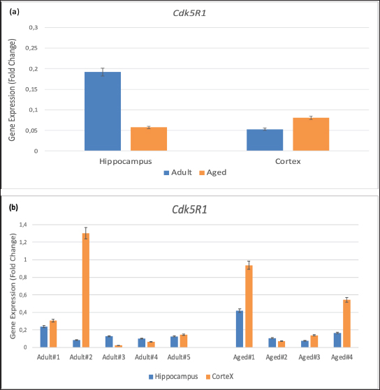 Fig. 3. Gene expression of Cdk5R1 in the hippocampus and cortex of adult cynomolgus monkeys compared with aged monkeys. (a) Group gene expression. (b) Individual gene expression. Values are presented as means error bars=SEM. In addition to playing a physiological role in neuroprotection and synaptic plasticity in the mammalian brain, CAPN1 is involved in the proteolysis of tau kinases like GSK3β and CDK5R1 (Kurbatskaya et al., 2016; Mahaman et al., 2019; Su et al., 2020). The regulation of the activation of calpains, which are involved in numerous cell life processes, is impaired with advancing age, elevated oxidative stress, and other excitotoxicity. The increased activation of these proteases implicates their involvement in the pathogenesis of several illnesses, including neurodegenerative diseases like AD (Mahaman et al., 2019). According to the findings of this study, older cynomolgus monkeys had greater CAPN1 gene expression levels of CAPN1 in the cortex than adults did. This is due to the possibility that numerous physiological processes, such as increased oxidative stress, have taken in older adults cynomolgus monkeys, which may have an impact on the activation increase. Aging is associated with increased oxidative stress and calcium dysregulation, which can activate the synthesis of CAPN1. Higher expression of CAPN1 can lead to increased cleavage of various substrates, including the CDK5 activators p35 to p25, which can then abnormally activate CDK5. This response may be a response to increased cellular damage or an attempt to manage protein aggregates common in aging brains. The GSK3 kinase that eliminates Ser21/9, GSK3β, can be activated by calpain at its N-terminal portion (Hoffmeister et al., 2020). According to the findings indicating an increase in calpain and GSK3β activity in the cortex region of aged animals, there is a positive link between CAPN1 and GSK3β in the brains of elderly cynomolgus monkeys and calpain-mediated proteolysis. Numerous players participate in neurogenerative processes, such as GSK3β’s cleavage and tau phosphorylation. Calpain 1 may be responsible for the up-regulation of GSK3β, abnormal hyperphosphorylation of tau, and neurofibrillary degeneration in AD (Jin et al., 2015). Therefore, it seems likely that in aged cynomolgus monkeys, tau phosphorylation occurs as a result of gradually increasing GSK3β expression, which confirms the findings of Lauretti and co-workers that GSK3β expression level increases with advancing age (Lauretti et al., 2020). The key component of the helical filament pairs is the phosphorylated tau protein, which can possibly lead to the development of paired helix filaments if GSK3β levels rise (Rankin et al., 2007). The GSK3β gene is involved in a variety of activities, including hyperphosphorylation, memory loss, increased amyloid-beta formation, inflammation, and apoptosis mediators, directly causing the loss of neurons in AD (Rankin et al., 2007). CDK5R1 is a CDK5/p25 activator that may play a role in AD-related nerve degeneration. The protease calpain converts p35/CDK5R1 to CDK5/p25, which may have a detrimental effect on AD by activating CDK5 and tau phosphorylation (Rankin et al., 2007). Older cynomolgus monkeys have higher CAPN1 and CDK5R1 gene expression in the cortex than do younger monkeys. Accumulation of p25/CDK5, which may have a role in the etiology of cytoskeletal abnormalities and neuronal death in neurodegenerative illnesses, has been reported after increased expression of the CDK5R1/p35 gen (Cooper-Patrick et al., 2024). It has been suggested that as long as NHPs are allowed to age naturally, they are somewhat resistant to the development of tau pathology (Jester et al., 2022). However, the findings of the present study demonstrate that gene expression in aged cynomolgus monkeys (>20 years) is increased in the cortex region for the three genes we examined. Research utilizing different gene markers and cynomolgus monkeys older than 30 years is required to determine whether other regulatory genes are involved in the creation of neurofibrillary tangles. Although this study successfully utilized qRT-PCR methods to analyze the expression of CAPN1, CDK5R1, and GSK3β in the cortex of aged and adult monkeys, it was limited by the lack of protein-level validation and functional assays to directly correlate gene expression changes with tau phosphorylation and neuronal health. The protein expression analysis and functional experiments is needed for the future study to provide a comprehensive understanding of the molecular mechanisms driving these changes in the aging brain. ConclusionIn summary, the higher expression of CAPN1, CDK5R1, and GSK3β in the cortex of aged monkeys suggests a complex interplay between aging, cellular stress responses, and potential early neurodegenerative changes. These gene expression changes may contribute to altered tau phosphorylation and other protein modifications that influence neuronal health and function in the aging brain. Further studies are needed to elucidate the precise mechanisms and consequences of these changes, which could provide new insights into the molecular understanding of brain aging and neurodegenerative diseases. AcknowledgmentsThe authors thank Yumni K Ghasani M.Si, DVM, Dyah Setyawati M.Si, DVM, Dr (med) Irma H. Soeparto MS, and Prof Steven J Scaphiro for their technical assistance in research preparation. This study was supported by the Research and Productive Innovation (RISPRO) LPDP program (Contract Id. PRJ/29/LPDP/2019). Conflict of interestThe authors declare no conflict of interest. FundingThis study was supported by the Research and Productive Innovation (RISPRO) LPDP program (Contract Id. PRJ/29/LPDP/2019). Author’s contributionsStudy design and supervised research: HSD, SSM, US, and LR. Sample collection and facility: HSD, US, and LR. Laboratory work and manuscript writing: HSD, LR, SSM, US, and JH. Manuscript revised by J. H. All authors h