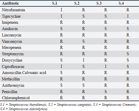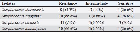 Table 4. Percentage of antibiotic sensitivity to Streptococcus species.
