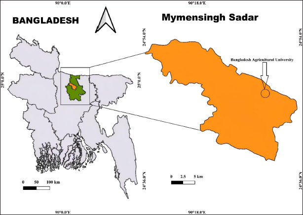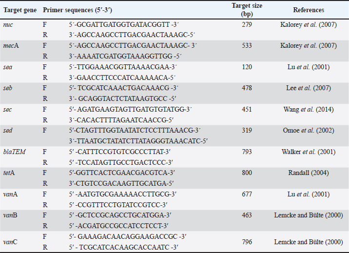 Fig. 1. Map of the site, where the study was conducted. Bacteriological analysisSample preparation and isolation of S. aureus The eggs were swabbed with sterile cotton buds and placed in trypticase soy broth for enrichment. The broth was then incubated in a bacteriological incubator overnight at 37°C. Following enrichment, samples were streaked onto mannitol salt agar (MSA) to isolate S. aureus. Pure colonies were obtained by subculturing all isolates on MSA plates, which were incubated for 24 hours at 37°C. The surfaces of the eggs were disinfected by dipping them in 70% ethanol for 3–5 seconds, followed by air drying in a safety cabinet. Each egg was then cracked using a sterile rod, and the egg contents (the inner membrane, egg white, and yolk) were transferred into a sterile petri dish. Microbial analysis was performed on the mixer comprising three components of the egg: the inner membrane, egg white, and yolk. To isolate S. aureus, 1 mm of the egg mixture contents was diluted tenfold with sterile phosphate-buffered saline (1X PBS; HI Media, India) and homogenized for 1–2 minutes. Then, a 100-µl aliquot of the resulting mixture was spread onto an MSA plate (HI Media) and, after solidification, incubated for 24 hours at 37°C. Identification of S. aureus The identification of S. aureus was conducted by observing the cultural characteristics and colony morphology of MSA. Gram staining method and biochemical tests (catalase test and coagulase test) were performed to identify bacteria. Molecular analysisDNA extraction and polymerase chain reaction (PCR) detection of enterotoxin and antibiotic resistance genes The boiling method was used to extract genomic DNA from isolated organisms (Ahmed and Dablool, 2017). Briefly, a 1 ml sample of the enriched culture was initially centrifuged at 5,000 rpm for 5 minutes. After discarding the supernatant, 200 μl of phosphate buffer solution was added to the pellet to create a suspension. The suspension was then boiled and allowed to cool for 10 minutes, followed by centrifugation at 10,000 rpm for 10 minutes. The resulting supernatant, which contained genomic DNA, was collected and stored at –20°C for future study. A final reaction mixture of 20 μl was used for all PCR experiments, comprising 3 μl of nuclease-free water, 10 μl of master mix (Promega, Madison, WI), 1 μl each of forward and reverse primers, and 5 μl of DNA template. After amplification, the PCR results were analyzed by electrophoresis on a 1.5% agarose gel. The gel was then stained with ethidium bromide and documented using a Biometra UV trans illuminator (Göttingen, Germany). A 100-bp DNA ladder (Promega, Madison, WI) was used as a reference marker to confirm the anticipated size of the amplified PCR products. A gene-specific PCR assay was performed to detect the specific gene associated with the detection of S. aureus. The assay successfully amplified the nuc, mecA, seb, blaTEM, tetA, vanA, and vanC genes using the PCR technique. The oligonucleotide primers used in this study for detecting these genes in S. aureus are listed in Table 1. Antibiotic susceptibility testing The antibiogram of S. aureus was performed using 13 commonly prescribed antibiotics: azithromycin (AZM, 15 μg), erythromycin (E, 5 μg), oxacillin (OX, 1 μg), penicillin (P, 10 μg), cefoxitin (CX, 30 μg), ciprofloxacin (CIP, 5 μg), levofloxacin (LEV, 5 μg), norfloxacin (NX, 10 μg), doxycycline (DO, 30 μg), tetracycline (TE, 30 μg), clindamycin (CD, 2 μg), gentamicin (GEN, 5 μg), and vancomycin (VAN, 30 μg). Prior to testing, each bacterial isolate was standardized to a McFarland 0.5 standard (Nix et al., 2020; Haile et al., 2022). The antibiotic disks were purchased from HI Media, India. The antibiotic sensitivity test was conducted using the disk diffusion method described by Bauer et al. (1966). The zones of inhibition produced by S. aureus were interpreted according to the guidelines of the Clinical and Laboratory Standards Institute (CLSI, 2021). Statistical analysisThe Statistical Package for Social Science (SPSS.v.25, IBM, Chicago, IL) and GraphPad Prism (Prism.v.8.4.2, San Diego, CA) were used to conduct analyses after the data from this study were integrated using Excel 365 (Microsoft/Office 365, Redmond, WA). The frequencies of the different variables were determined by descriptive analysis. By applying a prior technique (Brown, 2001) in GraphPad Prism, a binomial 95% confidence interval (CI) was computed to estimate the prevalence. To evaluate the possible relationship between the virulence genes of S. aureus isolates with a p-value of less than 0.05, a bivariate analysis was also carried out using SPSS. Additionally, SPSS bivariate analysis was used to determine any link between the two antibiotics that were shown to be resistant to the isolates. A p-value of less than 0.05 (p < 0.05) denoted statistical significance. Ethical approvalNo ethics approval was required for this study. ResultsPrevalence of Staphylococcus spp. and S. aureusBased on cultural and biochemical assessments, the prevalence of Staphylococcus spp. was 53% (n=100) in eggshell samples and 41% (n=100) in egg content samples. Among these isolates, 21% of the eggshell samples and 13% of the egg content samples were confirmed to be S. aureus via coagulase test. The prevalence of Staphylococcus spp. and S. aureus is summarized in Table 2. Table 1. Oligonucleotide primers used in the PCR assays.