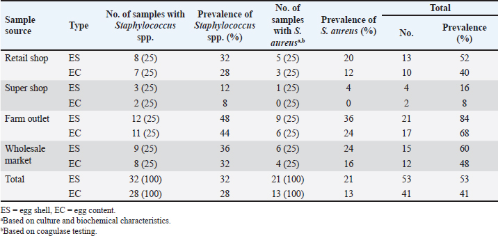 Table 2. The overall prevalence of Staphylococcus spp. and Staphylococcus aureus in table eggshell and content samples.