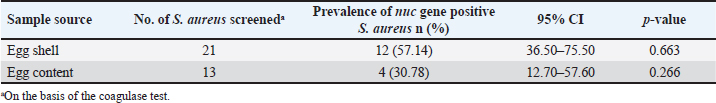 Table 3. Molecular detection of nuc gene of Staphylococcus aureus from eggshells and contents.