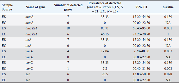 AbstractBackground: Staphylococcus aureus is a significant pathogen in both clinical and food safety contexts, capable of contaminating table eggs, which are a common dietary staple worldwide. Aim: This study aimed to assess the prevalence, molecular characteristics, and antibiotic resistance profiles of S. aureus isolated from table eggs. The focus was on identifying methicillin-resistant S. aureus (MRSA) strains that produce enterotoxin (seb), resistance to β-lactam antibiotics (blaTEM), tetracycline (tetA), and vancomycin-resistant S. aureus. Methods: A total of 200 egg samples were collected from various retail sources in Mymensingh City Corporation, Bangladesh. Swab samples (n=100) were collected from eggshells, and another 100 samples were collected from the inner membrane, egg white, and yolk. Samples were enriched in trypticase soy broth and cultured on mannitol salt agar. Staphylococcus aureus was isolated through conventional culture techniques, confirmed by polymerase chain reaction targeting the nuc, and further screened for the mecA, seb, blaTEM, tetA, vanA, and vanC genes. Antibiotic susceptibility testing was conducted using the disc diffusion method against 13 antibiotics. Bivariate analysis is used to assess the strong and significant correlations between virulence genes and the pairs of any of two antibiotic-resistant S. aureus. Results: Staphylococcus spp. and S. aureus were detected in 53% and 21% of eggshell samples, respectively, and 41% and 13% of egg content samples. Among 34 coagulase-positive isolates, 12 (57.14%) from eggshells and 4 (30.78%) from egg contents were positive for the nuc gene. Resistance was observed in eggshell isolates for mecA (33.33%), blaTEM (85.71%), tetA (33.33%), vanA (19.04%), vanC (33.33%), and seb (20.50%), whereas egg content isolates showed resistance to blaTEM (46.15%) and vanC (7.80%). All coagulase-positive isolates exhibited significant resistance to β-lactam antibiotics, cephalosporins, and glycopeptides, especially vancomycin. Notably, 19 (90.47%) and 12 (92.30%) eggshell and egg content isolates, respectively, were multidrug-resistant, with multiple antibiotic resistance indices ranging from 0.23 to 0.76. Conclusion: The study revealed a high prevalence of multidrug-resistant S. aureus in table eggs, indicating a significant public health risk. The presence of MRSA and strains with enterotoxins and resistance genes underscores the need for enhanced monitoring, stricter biosecurity measures, and robust control strategies for egg production and distribution to ensure food safety. Keywords: Antibiogram, Enterotoxin, MDR, MRSA, Table eggs, VRSA. IntroductionTable eggs are a widely consumed and affordable food source that are rich in protein, fats, vitamins, and minerals, making them a popular choice for a healthy diet worldwide (Puglisi and Fernandez, 2022; Myers and Ruxton, 2023). Although eggs are shielded by a hard shell and semipermeable membrane, they remain susceptible to microbial contamination, posing a potential risk of transmitting infectious agents that can induce illness in humans (Verma et al., 2023). Even apparently clean, unbroken, and freshly laid shell eggs may contain harmful bacteria, potentially resulting in egg-borne diseases (Damena et al., 2022). Consuming raw or undercooked eggs carries a notable risk of contamination due to pathogens naturally found in hens (Solís et al., 2023). These pathogens can migrate from the eggshell surface to its inner structures through pores, a process influenced by factors, such as humidity, temperature, and storage duration (Kulshreshtha et al., 2021; Rachtanapun et al., 2022). Inadequate handling and storage of eggs in unhygienic conditions at poultry farms or retail settings can negatively impact egg quality and present a potential health hazard to consumers (Jones et al., 2018; Damena et al., 2022). Previous studies have identified various bacterial species known to cause foodborne illnesses, such as Listeria monocytogenes, Escherichia coli, Salmonella enterica, and Campylobacter jejuni, in table eggs (Fonseca et al., 2014; Kubo et al., 2020; Ricke et al., 2023; Sharan et al., 2023). Staphylococcus spp. have been implicated in causing several diseases in poultry, with approximately 50% of Staphylococcus aureus strains producing enterotoxins capable of causing food poisoning in consumers (Pondit et al., 2018). Staphylococcal food poisoning, ranking third among all foodborne diseases worldwide, is caused by S. aureus, a Gram-positive, facultative anaerobic, nonmotile, nonspore-forming bacterium with a round shape, renowned for its toxic properties (Kadariya et al., 2014; Şanlıbaba, 2022). Staphylococcus aureus is typically found on the skin and in the nasal cavities of humans and animals as a commensal resident, which can spread from its natural habitats to other parts of the body, causing a range of clinical infections and foodborne intoxication (Achek et al., 2021; Raineri et al., 2022). Staphylococcus aureus is a Gram-positive bacterium known for causing a wide range of infections, from minor skin conditions to life-threatening systemic diseases (Lang et al., 2024). Staphylococcus aureus, a medically significant bacterium, causes various infections, ranging from skin and soft tissue issues to more severe conditions such as pneumonia, fasciitis, otitis media, and urinary tract infections (David and Daum, 2010; Tong et al., 2015). Staphylococcus aureus is a leading cause of food poisoning due to its production of heat-stable enterotoxins, which can persist in the food environment and cause illness (Grispoldi et al., 2021; Liang et al., 2023). Enterotoxin-producing S. aureus requires a temperature range of 10°C to 46°C for toxin secretion, with optimal growth and toxin production observed between 30°C and 40°C; conditions outside this range significantly reduce or inhibit toxin production (Argudín et al., 2010; Hennekinne et al., 2012). The rise of multidrug-resista