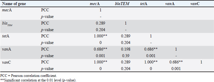 Table 5. Pearson correlation with different types of antibiotic resistance genes of eggshell isolates.