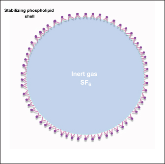 Fig. 4. Representative image of a microbubble used as an ultrasound contrast agent. The material consists of a lipidcoated membrane filled with gaseous content. The lumen is filled with sulfur hexafluoride (SF6). The figure was created using the Penup Samsung® application (Windows 11, Ldta, Samsung Electronics, Suwon, South Korea) and Canva Pro® (Canva Pty Ltd, Sydney, Australia). The product most commonly used in this technique is sulfur hexafluoride, a contrast element capable of remaining stable inside the vessels without diffusing through the vascular bed. The medium also has the potential to remain in the bloodstream for prolonged periods due to its low solubility in water and the high molecular weight of its gaseous molecules, which makes it resistant to external pressure (Volta et al., 2014) and is excreted by the lungs (Nyman et al., 2005). It can be administered mainly by two routes: intravenous and intracavitary (Takahashi et al., 2021). Contrasts have a low capacity to cause adverse reactions. In veterinary medicine, syncope and emesis are described after 24 hours of use (Seiler et al., 2013). In medicine, there are few reports of headaches, nausea, and increased body temperature after CEUS (Haers et al., 2010). The product is contraindicated for individuals with hypersensitivity reactions to any component of the contrast medium (Takahashi et al., 2021). The safety profile of the material used to perform CEUS has been extensively studied in children and has been shown to be highly safe with discrete, self-limiting, or easily reversible reactions (Rosado and Riccabona, 2016; Mao et al., 2019). The intravenous administration of CEUS is indicated for assessing intestinal perfusion. After application, the microbubbles are restricted to the intravascular space without entering the organ parenchyma (Fig. 5). Contrast media classified as second generation can remain in the vascular bed for approximately 10 minutes, and as the bubbles break, they are gradually eliminated through respiration (Takahashi et al., 2021). The physical properties of using microbubbles are due to the nonlinear detection that bubbles of different sizes produce when they are diluted in the patient’s blood and meet ultrasound echoes and, consequently, produce harmonic frequencies. The oscillation of this material in the evaluation region generates an intense contrast enhancement on the surface of the organ, as shown in the USG image, allowing microcirculation to be observed (Nyman et al., 2005). The image parameters used to evaluate this imaging method are related according to the degree of homogeneous or heterogeneous filling of the organ’s microcirculation by the microbubbles, mainly in specific circular regions within the tissues being examined. This defines the intensity patterns as “hyperintense” in tissues with greater intensity of visualization of the contrasted region, “isointense” in which it is not possible to distinguish the tissue adjacent to the evaluated region even with the use of contrast and “hypointense”, which determines a pattern of low intensity (Volta et al., 2014).