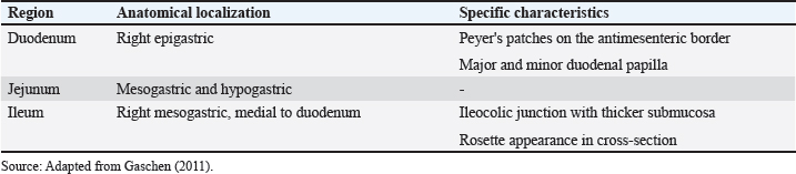 There is difficulty in scanning the colon due to the large amount of gas that is naturally present, plus the fecal material that is stored is an additive factor in the difficulty of evaluation (Larson and Biller, 2009). The transverse colon lies immediately caudally to the stomach and duodenum, while the descending branch can be found caudally and dorsally to the urinary bladder (Goggin et al., 2000). The segments of the colon are shown in Figure 2. When the colon is seen to be distended on ultrasound, it can be mistakenly characterized as a full uterus. However, the differentiation between the abdominal organs and the intestines on ultrasound, in addition to differential ultrasound diagnosis of diseases, can be obtained by checking intestinal peristalsis, the pattern of stratification of layers, and the topography of the intestine and its adjacencies (Drost, 2015). In dogs, the segments of the colon are often visualized on USG with gas or fecal distension and have a thinner wall than the other parts of the intestine in dogs (Penninck and D’anjou, 2015). The duodenum, jejunum, and ileum can be characterized on USG and differentiated based on some image findings, topography, mural stratification, and syntony with other intestinal segments (Gaschen, 2011). This information is detailed in Table 3. On USG, the five parietal layers can be assessed (Fig. 3), with an interface between the intestinal lumen and the mucosa that is hyperechoic and forms a bright, central line on the image. The mucosal layer is associated with this and is hypoechogenic, followed by the hyperechogenic submucosa. The thin muscular layer is hypoechogenic, and the outermost layer is the serosa, which is hyperechogenic (Goggin et al., 2000; Agut, 2009; Larson and Biller, 2009).