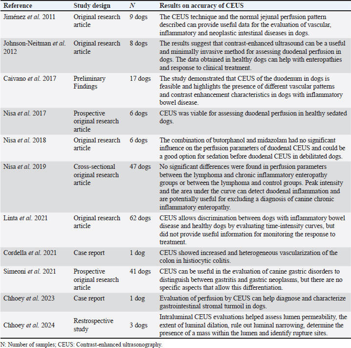 One study evaluated the repeatability and reproducibility of perfusion parameters using CEUS of the duodenum of healthy dogs under sedation. The results showed that in this experimental unit profile and under sedation, the parameters were stable, namely the time taken for the contrast to reach the duodenum until maximum enhancement, the degree of intensity of this enhancement, and the entry and exit rates of the microbubbles. Despite these results, a further study in dogs with intestinal disorders was suggested to determine the clinical applicability of the test (Nisa et al., 2019). Subsequently, the duodenum of dogs with CE and alimentary lymphoma was evaluated using CEUS. The CEUS-derived data showed that the regional blood volume in the duodenal mucosa was increased in dogs with CE compared with the control group. These results also suggest that perfusion parameters can be used as predictive values for duodenal inflammation in symptomatic animals. However, the modality was not sufficient to differentiate CE from alimentary lymphoma given the similarity of CEUS findings in both conditions (Nisa et al., 2019). In a more recent study, CEUS was effective in distinguishing dogs with CE from those without intestinal disease using the results of the microbubble contraction time and intensity curve. However, qualitative evaluation could not determine this differentiation. Furthermore, the method is not capable of evaluating the monitoring of response to treatment independently if qualitative and quantitative metrics are considered (Linta et al., 2021). In a case report of granulomatous colitis in a French Bulldog multiple diagnostic imaging techniques were used, such as B-mode USG, elastography, and CEUS. Contrast enhancement showed greater demarcation in the serosa and muscular region and, to a lesser extent, in the mucosa and submucosa, as well as an accelerated wash-in and wash-out pattern, which determined increased and heterogeneous circulation in the colon (Cordella et al., 2021). In general, in the veterinary medical literature, the application and use of CEUS are more restricted to intestinal perfusion studies, specifically in the duodenum. In some cases, the technique has been described in the use of dogs with CE and alimentary lymphoma (Nisa et al., 2019). Considering the scarcity of publications on the subject, a recent study aimed to prospectively evaluate the feasibility of CEUS in the duodenal perfusion of dogs, to observe the enhancement pattern and, in addition, to follow up dogs treated in a standardized way for intestinal affection using this imaging exam (Linta et al., 2021). We emphasize that although USG can provide important information about the GIT in dogs, it is important to consider that its indication should not be based solely on isolated clinical signs. It is necessary to associate clinical information, physical examination findings, and correlations with laboratory results. In some situations, ultrasound examination may be inconclusive because of the lack of specificity of clinical gastrointestinal signs in dogs. Therefore, we believe that USG is an important diagnostic tool, but it must be used based on well-defined clinical criteria. ConclusionThe anatomical and functional complexity of GIT in dogs, together with the frequent diseases that affect the intestines of these animals and the nonspecific clinical signs, highlight the importance of auxiliary diagnostic methods. This underscores the relevance of basic and advanced CEUS. These dynamic procedures help assess both functionality and morphology. We emphasize that USG results can be nonspecific if the underlying cause of the disease is not related to the gastrointestinal tract. Due to the nonspecificity of gastrointestinal clinical signs, ultrasound examination should be indicated based on the entire clinical context, history, and other complementary tests. B-mode ultrasound has limitations for gastrointestinal assessment, such as the experience of the examiner, the presence of gas in the GIT, the depth of the organs assessed, and anatomical variations between species and breeds. CEUS for intestinal assessment has limitations, such as being restricted to use in animals with heart disease and respiratory disorders and the lack of studies with reference parameters for different enteropathies. An analysis of the descriptions of the sources used in this study shows that B-mode and CEUS are valuable approaches for noninvasive intestinal assessment. These findings emphasize the growing importance of combining different complementary tests to understand the pathophysiology of enteropathies. It is worth noting that studies are still needed to fill the gaps in the literature on the methodology of applying these imaging tests, to standardize reference values and measurements, to systematize execution, and to provide practical clinical applications for the different diseases affecting the intestines of dogs. AcknowledgmentsThe Veterinary and Zootechnical School of the Federal University of Goiás, Brazil. Conflicts of interestThe authors declare no conflicts of interest. FundingThis research did not receive any specific grant. Data availabilityAll data supporting the findings of this study are available in the manuscript. Authors’ contributionConceptualization I. M. O., N. C. B., W. P. R. S., methodology I. M. O. and W. P. R. S., formal analysis N. C. B., data curation; I. M. O., W. P. R. S., drafted the manuscript; N. C. B., revised the manuscript; I. M. O., and N. C. B., translated the manuscript. All authors have read and agreed with the published version of the manuscript. ReferencesAgut, A. 2009. Ultrasonography of the small intestine in small animals. Vet. Focus 19, 20–28. An, Y.J., Lee, H., Chang, D., Lee, Y., Sung, J.K., Choi, M. and Yoon, J. 2001. Application of pulsed Doppler ultrasound for the evaluation of small intestinal motility in dogs. J. Vet. Sci. 2, 71–74. Baun, J. 2017. Contrast-enhanced ultras