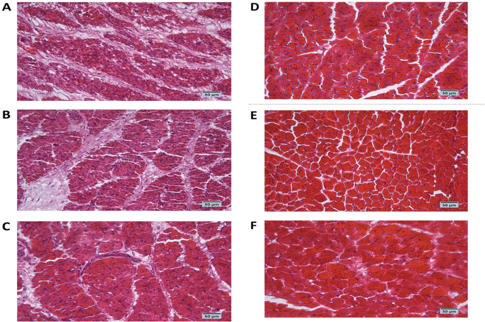 Fig. 1. Cross-section of pectoral muscle at ED18 and post-hatching at day 10 stained by H&E stain under magnification power ×40 showing differences in myofiber diameter by light microscopy. (A) Control at ED18=37.8°C; (B) TM1 at ED18 from ED 4–7 at 39°C for 18 hours; (C) TM2 at ED18 from ED 7–10 at 39°C for 18 hours. The three figures showed clear connective tissue formation that appeared as white fibers within the muscular tissues. (D) the control at post-hatch at day 10 at 37.8°C; (E) TM1 at post-hatch day 10 from ED 4–7 at 39°C for 18 hours; (F) TM2 at post-hatch day 10 from ED 7–10 at 39°C for 18 hours. The D, E, and F figures showed that the connective tissues were replaced with clear myocyte, indicating an increased mass of the muscular tissues. Impact of heat treatment on Hsp60, Hsp70, Hsp90, and Hsp108 mRNA expressionThe mRNA expression of HSPs (Hsp60, Hsp70, Hsp90, and Hsp70) in TM1 varied between the pectoral and thigh muscles due to heat manipulation (Table 4). Compared to the group’s pectoral muscle (across the EDs), the thigh mRNA gene expression of the genes in TM1 was noticeably higher. In addition, no statistically significant differences were observed in the mRNA expression of genes between the pectoral TM1 and control groups. In the thigh muscle, TM1 expression was significantly higher expression than the control group, with Hsp70 showing a higher expression level than Hsp60, Hsp90, and Hsp108. In contrast to the control, the results for ED10 showed that temperature modification had no appreciable effect on Hsp70, Hsp90, or Hsp108 in the TM2 pectoral and thigh muscles. The expression of Hsp60 was significantly reduced in the pectoral and thigh muscles of TM2 compared with the control. There was no detectable effect of heat treatment of TM1 in ED18 on the mRNA expression of Hsp60, Hsp70, and Hsp108 in thigh muscle. Furthermore, TM1 significantly upregulated Hsp90 expression in the thigh muscle compared with the control. The results also demonstrated that TM had no appreciable effect on the mRNA expression of Hsp60, Hsp70, Hsp90, and Hsp108 in the pectoral muscle of TM1 compared with the control. Additionally, there were no discernible changes in the mRNA gene expressions of Hsp60, Hsp70, Hsp90, and Hsp108 in the thigh muscle when TM of TM2 at ED18 was applied compared with the control. Furthermore, compared with the control, TM of TM2 at ED18 dramatically increased the expression of Hsp90 in the pectoral muscle alone. Table 4 illustrates the considerable decrease in the mRNA expression of Hsp60, Hsp70, and Hsp108 in the pectoral muscle of TM2 compared with the control. The results of posthatching analysis on day 10 showed that the pectoral muscle of TM2 had considerable mRNA expression of Hsp60, Hsp70, Hsp90, and Hsp108 compared with the control and TM1. Furthermore, compared with the control and TM1, TM2 has dramatically increased the expression of Hsp70 in the thigh muscle alone. Table 4 showed that there was no discernible variation in the mRNA gene expressions of Hsp60, Hsp90, and Hsp108 in either the pectoral or thigh muscle when compared with the control to TM1 or TM2.