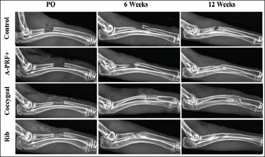 Fig. 2. Radiographic evaluation (mediolateral views) of surgically repaired segmental radius bone defects in rabbits. The radiographs illustrate the bone formation in the control, A-PRF+, coccygeal, and rib groups at postoperatively (PO), 6, and 12 weeks post-surgical intervention.
