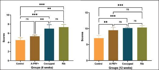 Fig. 3. The graphs illustrate Lane–Sandhu radiographic scoring results at 6 and 12 weeks postoperatively. The findings were displayed as the mean and standard deviation for each group. The symbols ** and *** indicated statistically significant differences, corresponding to p values of less than 0.01 and 0.001, respectively. The symbol ns signified that there was no statistically significant difference present. The results of the CT examination for untreated and repaired bone defects are presented as a three-dimensional reconstructed image in Figure 4. The untreated control group confirmed a lack of bone formation, showing a clear bone gap at both the 6- and 12-week time points. The bone gap continued to be noticeable in the treated A-PRF+ group at 6 weeks, despite an increase in bone tissue growth. In the coccygeal and rib groups, bone tissue growth was guided by bridging the gap without entirely closing it at 6 weeks. In the A-PRF+, coccygeal, and rib groups, the newly formed bone was fully integrated with the adjacent host bone at 12 weeks’ post-implantation. The graphs in Figure 5 reflect the results of Cheung’s CT score. The rib group had significantly higher grades than the control and A-PRF+ groups at 6 weeks post-implantation. The data revealed statistical significance between the rib and control group (p < 0.01), the rib and A-PRF+ group (p < 0.05), and the coccygeal and control group (p < 0.05). The A-PRF+ scores were not statistically different from those of the control group (p > 0.05). Cheung’s CT scoring revealed a significant difference between the rib, coccygeal, and A-PRF+ groups and the control group at 12 weeks, with p values less than 0.01 and 0.05, respectively, but no statistical significance was seen between groups. As shown in Figure 6, the macroscopic analysis of the bone specimens confirmed the presence of soft tissue within the defects as well as the absence of fusion with the host bone. The defects were clearly observed in the control group at both 6 and 12 weeks’ post-implantation, as well as in the A-PRF+ group at 6 weeks. In the rib and coccygeal groups, partial bone fusion with the host bone was observed 6 weeks after surgery. In contrast, at 12 weeks of treatment, the A-PRF+, coccygeal, and rib groups had completely healed their bones since the defect had been replaced with hard tissues that were identical to bone.