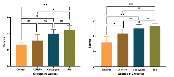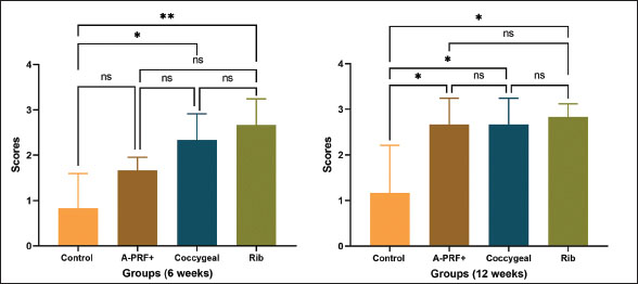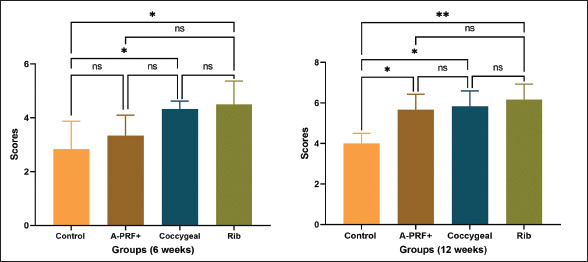 Fig. 7. The graphs illustrate macroscopic scoring results at 6 and 12 weeks postoperatively. The findings were displayed as the mean and standard deviation for each group. The symbols * and ** indicated statistically significant differences, corresponding to p values of less than 0.05 and 0.01, respectively. The symbol ns signified that there was no statistically significant difference present.