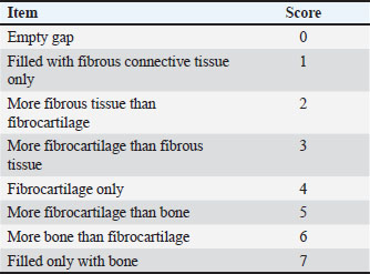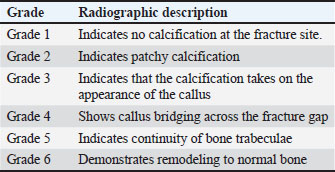 Fig. 1. Autogenous radius bone grafting in rabbits (A): Control group: the defect was left untreated. The white arrow indicates the ulnar bone. (B) and (C): Prepared fibrin clot of A-PRF+. (D): The defect was implanted in A-PRF+. (E) The defect was implanted with the third coccygeal vertebra. (F): The defect was implanted in the 11th rib. Surgical procedureThe rabbits were pre-anesthetized with 0.75 mg/kg of intramuscularly administered acepromazine maleate 1.5% (Castran, Interchemie CO., Netherlands) and a subcutaneous injection of xylazine 2% (Xyla, Interchemie CO., Netherlands) at a dose of 5 mg/kg. The induction of general anesthesia was performed with 35 mg/kg of 5% ketamine hydrochloride (Panpharma Laboratory, Fougères, France) administered intramuscularly (Boudra et al., 2020). The left forelimbs of rabbits were prepared for surgery by shaving and aseptically preparing the skin with 10% povidone-iodine. The animals were then positioned laterally on the operating table. Under general anesthesia, a 4 cm craniomedial surgical incision was made across the left forelimb. The muscles were dissected to expose the radius. A 10 mm segmental radius bone defect was created at the diaphyseal site of the bone, and the interosseous ligament was surgically severed, facilitating the removal of the bone segment. The treatment of radius bone defects was performed according to the designated group distribution, as shown in Figure 1. After filling the bone defect, the internal fixation of the radius was considered unnecessary because the ulna provided adequate support. The surgical incision was subsequently closed with 2/0 vicryl sutures for the muscle and subcutaneous layers and 2/0 braided silk sutures for the skin. Cefazolin sodium 1 g (Zinol, Pharco Pharmaceuticals, Alexandria, Egypt) was given intramuscularly for 5 days at a dosage of 20 mg/kg (Demirel and Aksakal, 2015). To alleviate postoperative pain, meloxicam 0.75% (Amriya Pharmaceutical Industries, Alexandria, Egypt) was administered at a dosage of 0.6 mg/kg subcutaneously for a duration of 3 days (Varga, 2014). The rabbits were monitored in a recovery room post-surgery until they regained consciousness. The surgical skin stitches were taken out 7 to 10 days after the operation. The rabbits were sacrificed at 6 and 12 weeks following the surgery. Radiography and computed tomography (CT) were used to assess the treated radius bone defects, along with histopathological evaluation including macroscopic and microscopic analyses. Radiography and CT scanA radiographic evaluation was conducted using an X-ray generator (Pox-300 BT, Toshiba, RotanodeTM, Japan) with exposure factors of 2.5 mAs, 40 kVp, and 50 mA. A mediolateral radiograph was acquired on the day of surgery, as well as at 6 and 12 weeks post-surgery. Two orthopedic specialists independently assessed the treated bone defect area using the Lane–Sandhu radiographic scoring criteria, as shown in Table 1 (Zhao et al., 2021). CT scans of repaired radius bone defects were performed at 6 and 12 weeks postoperatively using a GE Lightspeed VCT 64 CT system (WIPRO GE HEALTHCARE PVT. LTD., Karnataka, India) at 140 KV and 50 mA. The RadiAnt DICOM viewer (Medixant, Poznan, Poland) was used to visualize the reconstructed coronal and three-dimensional (3D) images. The treated bone defect site was scored by two blinded orthopedic experts using Cheung’s grading standards, as shown in Table 2 (Ibrahim et al., 2016). Histopathological evaluationEvaluations at the macroscopic level were conducted 6 and 12 weeks post-surgery. The soft tissue was removed from the left radius and ulnar bone. The bones were subsequently imaged and assessed by two specialists using the scoring system of 0 to +3 as defined by Parizi et al. (2013). A score of 0 signifies complete instability at the defect site, indicating nonunion. Scores of +1 and +2 were given when cartilage, soft tissue, or cracks were observed within the defect, suggesting a potentially unstable union. Bone bridging, signifying a complete union, was assigned a score of +3. Samples from repaired radius bone defects of rabbits were collected for microscopic examination at 6 and 12 weeks post-operations using a slow-speed saw. The samples were then fixed in a 10% buffered neutral formalin solution for 48 hours, decalcified for 3 weeks in a mixture of hydrochloric acid HCl 10% and formic acid 10%, dehydrated in an increasing ethanol gradient, cleared in xylene, and embedded in paraffin wax. Five micron-thick paraffin block sections were cut using a microtome (Leica RM 2155, England). The defect sites were subjected to longitudinal sections. Hematoxylin and eosin (H and E) and Masson’s trichrome were used to stain the specimens. Two separate histopathologists conducted the assessment process blindly, examining and analyzing all slides from all groups using Emery’s scoring system, as shown in Table 3 (Emery et al., 1994). Table 1. Lane–Sandhu radiographic scoring criteria.