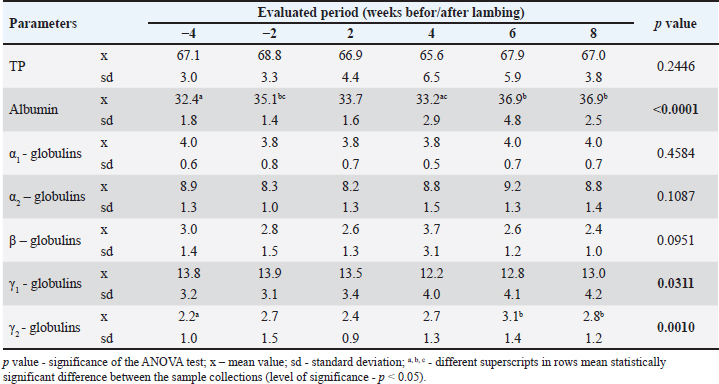 Table 2. Changes in the absolute concentration of total proteins (TPs) and the analyzed protein fractions in ewes during the peripartum period (g/l).