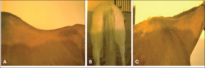 Fig. 1. A -(Lordosis), B- (Muscular atrophy) and C- (Saddle mark). 2. Rectal examination Rectal examination was performed to assess the ventral aspect of the caudal lumbar and sacrum for the presence of any painful swelling (intervertebral discs), evidence of iliac thrombosis, psoas and iliac myositis, prepubic tendon, inguinal rings, pelvic fracture, or sacroiliitis. B. Examination during exercise1. In hand On a loose rein, the presented horse was walked and trotted to assess gait abnormalities or claudication (poor hock flexion, dragging the toes, straddling of hind limbs, stiffness, or ataxia, and incoordination). Frequent turning of the horse in both directions was also performed to assess the flexibility of the spines. The back-and-down of the horse was also attempted to evaluate the sacroiliac joint. The Spavin test was performed to exclude hock or stifle problems. 2. Lunging Lunging exercise of the horse for 10 minutes in a sandy lunge yard was performed to evaluate the horse’s strides and the effect on gait when the horse warmed up. 3. Ridden and jumping The presented horse was saddled up to note any pain or discomfiture during girthing or mounting (cold back). The horse was then ridden by the usual rider to assess the horse’s responding at walk, trot, and canter. The horse was then tried to jump on a combination of 1 m fences with 10 m in between distances to evaluate the horse’s action with exaggerated exercise (i.e., rush against the fences or showing reluctance and resentment). Many other important sign criteria were also recorded, which depended on the rider’s experience and included: refusal to stand during mounting, sinking when the rider mounts, resenting the girth tightening, jumping mistakes or refusal, difficulty in ascending hills, bucking during upward transition from trot to canter/lope, stiffness and abnormal movement of the back, changing of jumping style, vigorous tail movement, teeth grinding, dragging one or more of the hind feet and reluctance to backing. C. Special tests for back pain assessment (Licka and Peham,1998)1. The active lateral bending range of motion of the neck and trunk (ALBRM). The assistant’s hand holding the green fodder bundle was directed toward the horse’s elbow and then placed against the lateral girth (Fig. 2A). The motion expressed by the horse’s head and neck toward the food bundle was recorded to assess mid-to-lowering neck flexion in lateral bending and rotation. Any marked limitation of motion or stiffness was recorded as unsound. 2. The active flexion range of motion of the mid-to-lower neck and withers (AFRM). The assistant’s hand holding the food bundle was directed cranially between the forelimbs and toward the front feet to assess the active flexion range of motion of the mid-to-lower neck and withers (Fig. 2B). Any marked limitation of motion or stiffness was recorded as unsound. 3. Spinal reflex test This test was performed by stroking any blunt object alongside the vertebral column from the withers to the base of the tail to test the dorsoflexion and ventroflexion of the back. Any reluctance or exaggerated response was recorded as unsound. D. Diagnostic imaging1. Radiographic examination A portable radiography device with limited imaging capacity (Kv100 & mA 30) was used. Lateral views of the dorsal apexes of the T2–T3 spinous processes on large-size films 35X43 cm were visualized in the standing position in certain cases only. 2. Ultrasonography examination Supraspinous and sacroiliac ligament ultrasonography in transverse and longitudinal planes were performed using a portable ultrasound machine and a 7.5-MHz linear array transducer. A stand-off water-bag cushion was used to improve the resolution of superficial structures. Three sound horses were also scanned US at the same locations for comparison (Fig. 3).