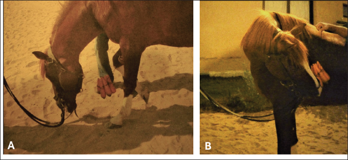 AbstractBackground: Showjumping athletic horses are frequently affected by back pain, which in turn influences their performance and equestrian activities. Aim: The aim of the present study was to determine the etiological factors predisposing to back problems in show jumping horses and how to diagnose, and manage them. Methods: A total of 75 cases (45 geldings and 30 mares, aged between 8 and 23 years and weighing 420–550 Kg) with histories suggestive of back problems and low competitive ability as show jumping were used in this study. The evaluation of data was based on the inputs of case history, clinical signs, clinical examination, local analgesic injection, and diagnostic imaging. Results: The demonstrated types of back disorders were back deformities (lordosis, scoliosis, and sacral hunter bump) (5 cases–6.66%), muscular strain (18 cases–24%), sacroiliac sprain (30 cases–40%), vertebral lesions, mostly crowding and spondylosis (16 cases–21.33%), and skin lesions due to tack or rider-induced back pain (saddle mark, lumps or scars) (6 cases–8%). Treatment included rest, anti-inflammatory drugs, and intra-articular injection of local corticosteroids. Conclusion: Conventional clinical examination visually, at rest, exercise, and spinal reflexes is indispensable for the diagnosis of back disorders. Complementary diagnosis via diagnostic imaging and local analgesic injection is necessary to determine the location of pain. Keywords: Back disorder, Show jumping horses, Diagnosis, Management. IntroductionBack problems have been documented as an important cause of performance problems in athletic horses (Jeffcott, 1980; Turner 2011; Mayaki et al., 2019). Back pain can arise from a variety of conditions revolving around soft tissue desmopathy lesions of the supraspinous and interspinous ligament and strain of the longissimus muscle (Greve and Dyson, 2014; Findley and Singer, 2015). Osseous injuries include impinging dorsal spinous processes (IDSP, kissing spines), osteoarthritis of articular processes, intervertebral disc disease, mal-conformations, and vertebral fractures (Jeffcott, 1980; Wong et al., 2006; Girodroux et al., 2009; Zimmerman et al., 2012), tack-associated problems (poor saddle fit), and excessive rider weight (Dyson et al., 2015). Clinical signs are often nonspecific and may include poor performance, refusal at jumps, reduced hindlimb impulsion, poor croup muscling, back soreness, reluctance to trot or pace at high speeds, or low grade and shifting hindlimb lameness (Cauvin, 1997; Jeffcott, 1980; Landman et al., 2004). The diagnosis of back pain in horses depends on the clinical examination and diagnostic imaging, including ultrasound, radiography, and thermography (Jeffcott, 1993; Denoix, 1999; Fonseca et al., 2006; Henson et al., 2007; Kent Allen et al., 2010; Soroko and Howell, 2018). Modern diagnostic modalities, such as computed tomography (CT) and nuclear scintigraphy, are promising for diagnosis but are not easily available to practitioners (Burns et al., 2018). Treatment is focused primarily on relieving pain using nonsteroidal anti-inflammatory (NSAIDs), muscle relaxants, corticosteroids, and local analgesics (Shokry, 2016; DeMelo and Ferreira, 2021). Surgical resection of the impinged parts of the spinous process in affected horses is used (Walmsley et al., 2010). Chiropractic and physiotherapy may be directly applied to back problems for rehabilitation and stimulation of neurological reflexes using thermal modalities, massage, acupuncture, and shock waves (Martin and Klide, 1987; Ridgway and Harman, 1999). With the increase in interest in equestrian sports in recent decades, attention has become devoted to the health status of athletic horses, which has become a real challenge that must accompany the prosperity of this sport. Back problems are one of the main problems that influence patient performance; therefore, they require a comprehensive study in addition to choosing a systematic diagnostic protocol according to limited capabilities and a reliable treatment option. Materials and MethodsThis study was conducted on 75 track and field horses with histories suggestive of back problems. All horses were from the Police Academy in Cairo. The horses were sorted as Hunter-jumper (25), Holsteiner (21), Thoroughbred (19), and Hanoverian (13). The breed encompassed 48 geldings and 30 mares, aged between 8 and 23 years, and weighed (420–550 Kg). Clinical examinationHistory A standard examination chart was designed for each presented case. Signalments of the horse, including age, sex, breed, sport type, and complaint, were recorded. Questions concerning information about the onset, duration, experience of the rider, condition of the tack and shoes, type of bridle, and temperament. A. Examination at rest1. Visual The affected horse was examined while standing on an even ground to assess: back mal-conformation (lordosis, kyphosis, or scoliosis), muscular atrophy (back, quarter, or thigh), and skin lesions (lumps, scars, or saddle marks). Palpation by digital pressure and pinching of the horse’s midline of the back to assess any hot spots, dipping, humping, tenderness, resentment, discomfort, or cringing was performed (Fig. 1 A–D).